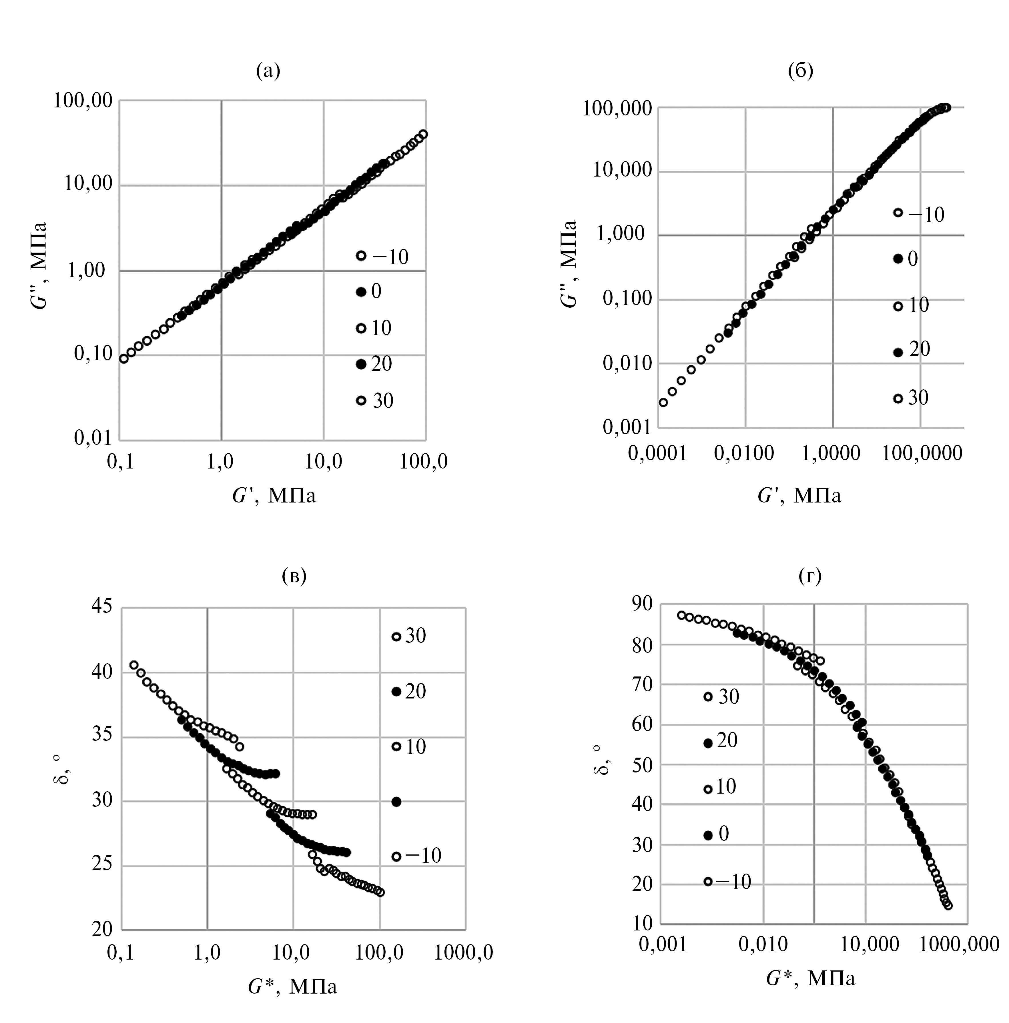 На рис. 1а и 1б для образцов с крайними значениями CIG – E-3 (CIG = 0,82) и F-1 (CIG = 0,23) приведены графики Cole–Cole, построенные на основе данных испытаний по первому способу частотной развертки, выполненной в диапазоне 30–10°C с шагом в 10°C с использованием одного образца для всех температур испытаний. Как можно видеть, зависимости G″ от G′, полученные при разных температурах, хорошо совмещаются, формируя непрерывные кривые. Также хорошее совмещение было получено для всех несостаренных и состаренных образцов, приведенных в табл. 2. При анализе рис. 1б можно отметить плато при температуре –10°C, что может быть связано с процессом низкотемпературного стеклования образца F-1 с учетом того, что температура хрупкости по Фраасу данного образца составляет –9°C (см. табл. 1).