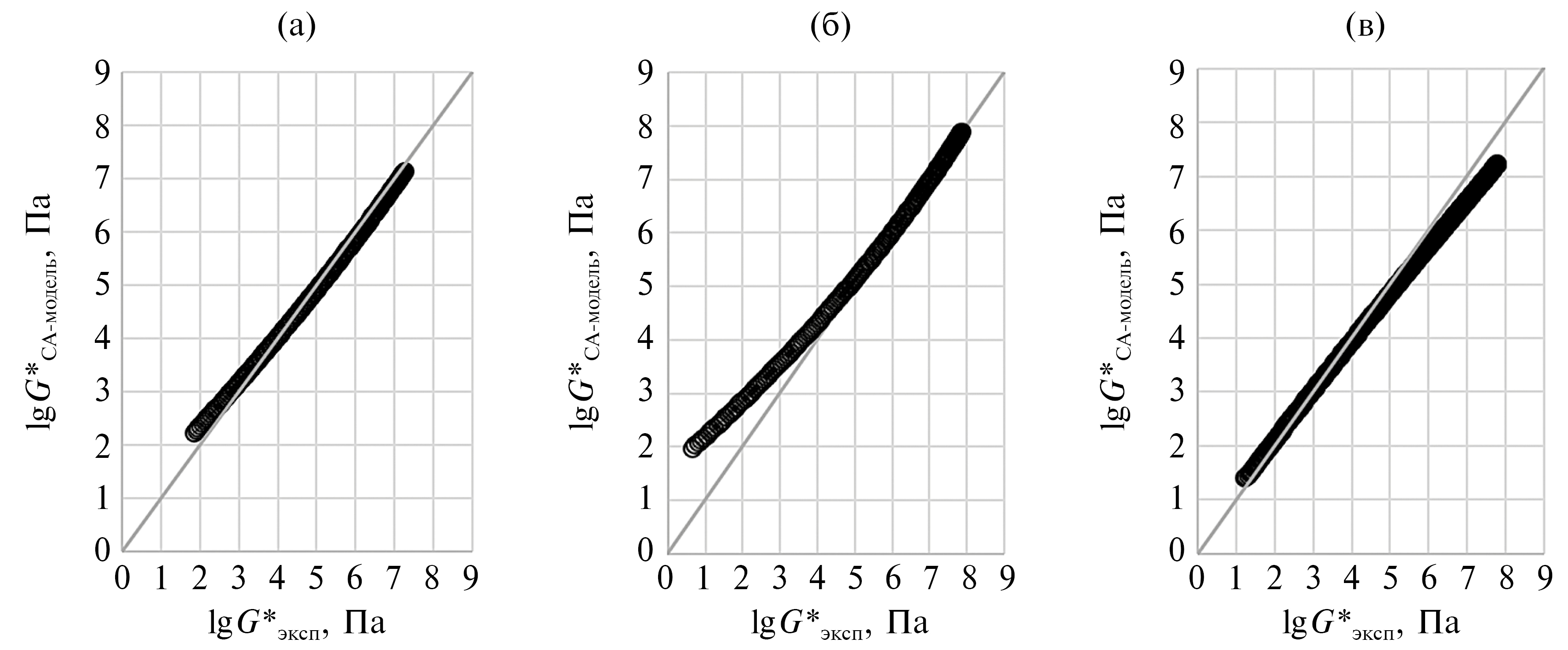 На рис. 2 на примере трех образцов, различающихся значениями коллоидного индекса Гестеля: H-1 (CIG = 0,47), F-1 (CIG = 0,23), E-3 (CIG = 0,82), для опорной (reference) температуры 10°C представлены графики экспериментальных и расчетных (по СА-модели) значений комплексного модуля (G*). Для образца H-1 (CIG = 0,47) (рис. 2а) можно отметить хорошее соответствие экспериментальных и расчетных данных. Также хорошая сходимость экспериментальных и расчетных значений G* при опорной температуре 10°C наблюдалась при значениях CIG от 0,67 до 0,35.