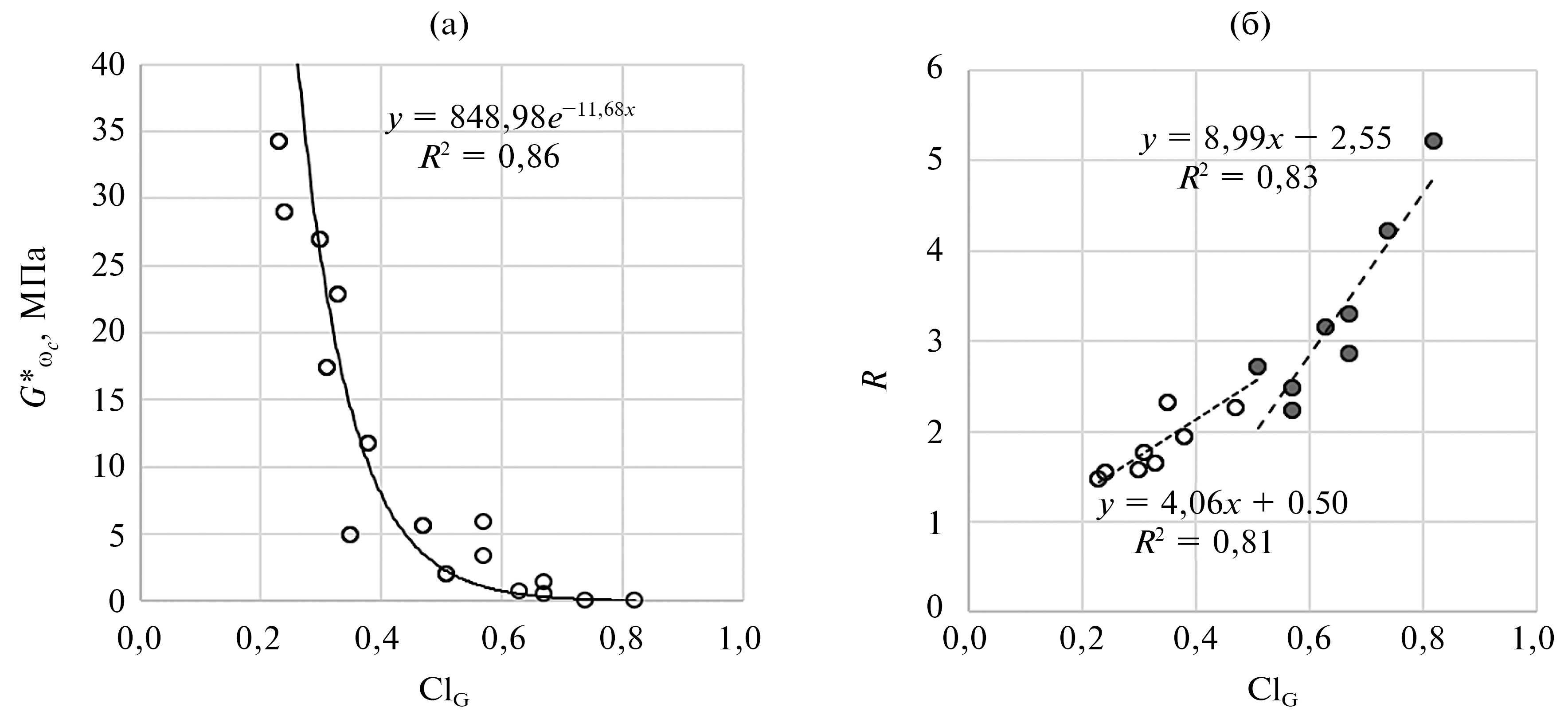 В то же время для комплексного модуля при ωс наблюдаем аппроксимацию с коллоидным индексом Гестеля (CIG) при рассмотрении всего массива образцов в виде экспоненциальной функции с R2 = 0,86 (рис. 3а). Однако при перестроении графика в виде зависимости реологического индекса R = lgGg –lgG*ωс от CIG (рис. 3б) можно считать, что для двух групп образцов (проявляющих термореологически простое и термореологически сложное поведение при 10°C) налюдается достаточно неплохая корреляция в виде линейных функций.