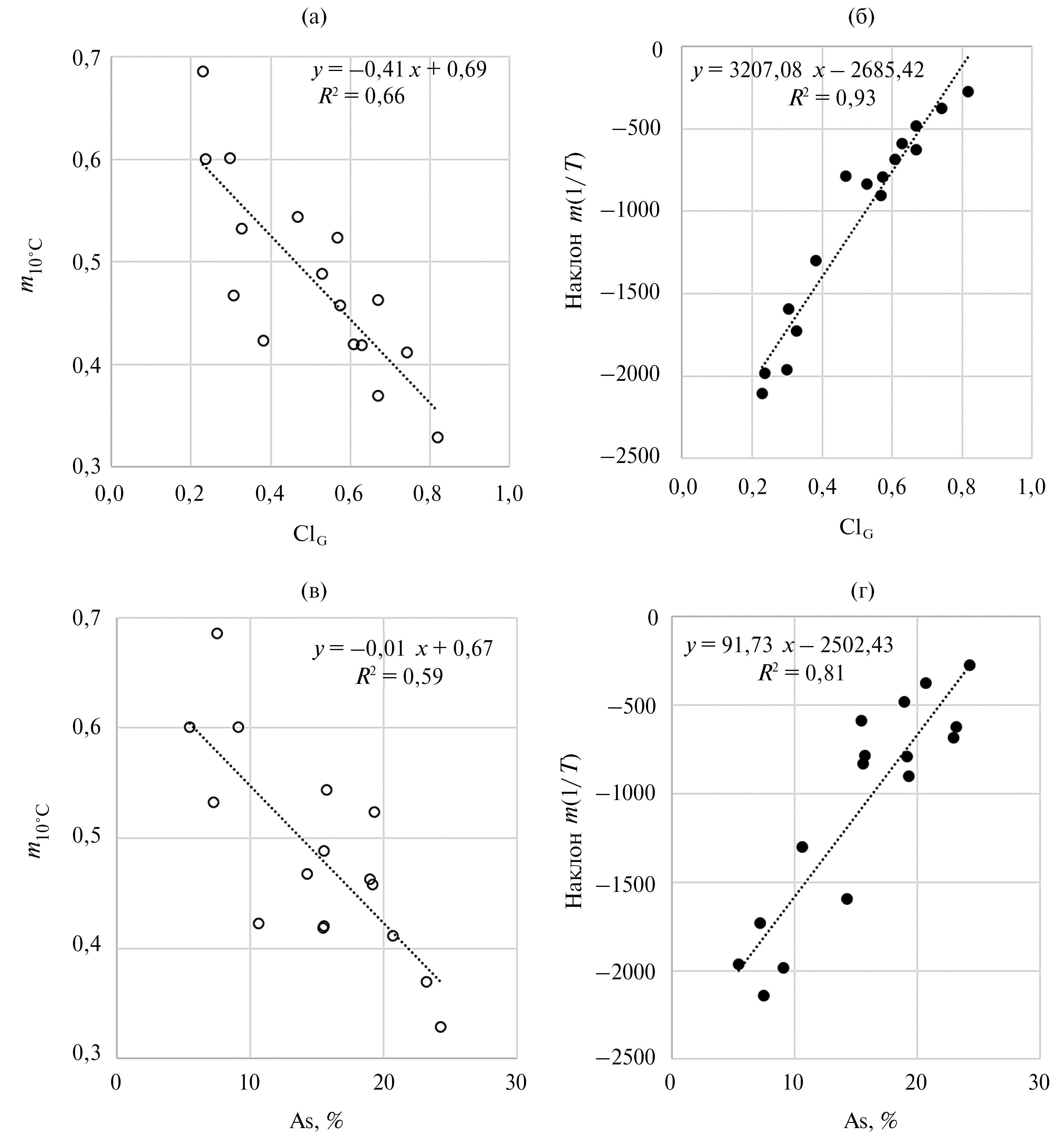 Вместе с тем параметры m, 1/m и 1+1/m (последние два используются в формулах (3) и (4)) не показали хорошей корреляции ни с групповым химическим составом, ни со структурными параметрами (см. рис. 4а и 4в для параметра m, остальные рисунки не приводятся), ни с реологическим индексом (R) исследованных битумов, определенным по CA-модели – во всех случаях R2 < 0,67 (рисунки не приводятся). Также для параметров наклон кривой 1/m от 1/T и наклон кривой 1 + 1/m от 1/T отсутствует корреляция с групповым химическим составом, структурными параметрами и реологическим индексом – во всех случаях R2 < 0,24 (рисунки не приводятся).
