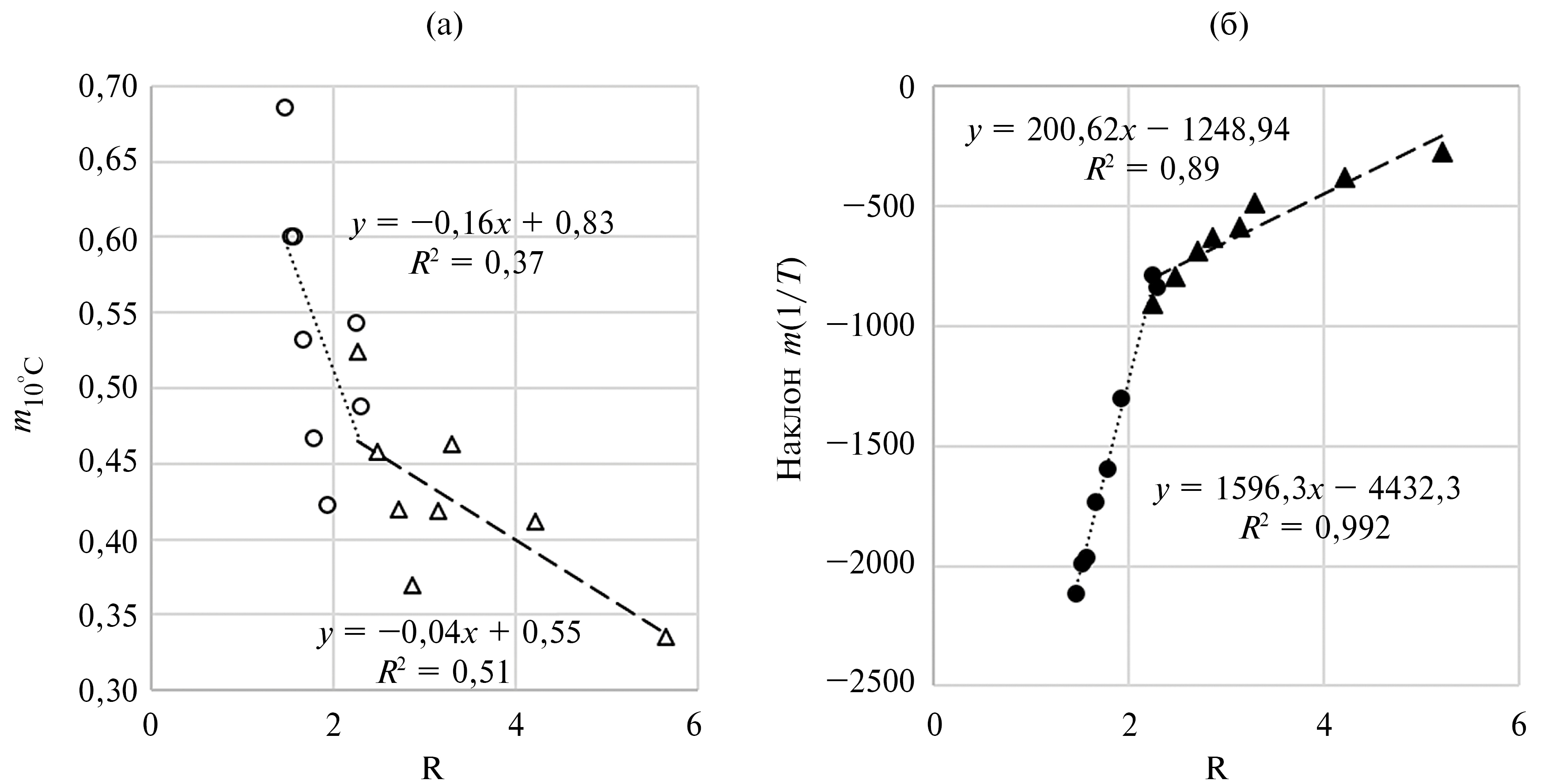 В то же время параметр наклона кривой m(1/T) имеет хорошую корреляцию с CIG (R2 = 0,93) и с содержанием асфальтенов (R2 = 0,81). Зависимость наклона m(1/T) от реологического индекса (R) можно аппроксимировать полиномиальным уравнением 4-й степени с корреляцией R2 = 0,99, но из соображений, что температурная чувствительность параметра m от структуры образца должна коррелировать с этой структурой, она может быть представлена двумя прямыми: для образцов, проявляющих простое и сложное термореологическое поведение (рис. 5а). Для сравнения на рис. 5б приведена зависимость m от R при опорной температуре 10°C, которая отражает только тенденцию к наличию двух прямых.