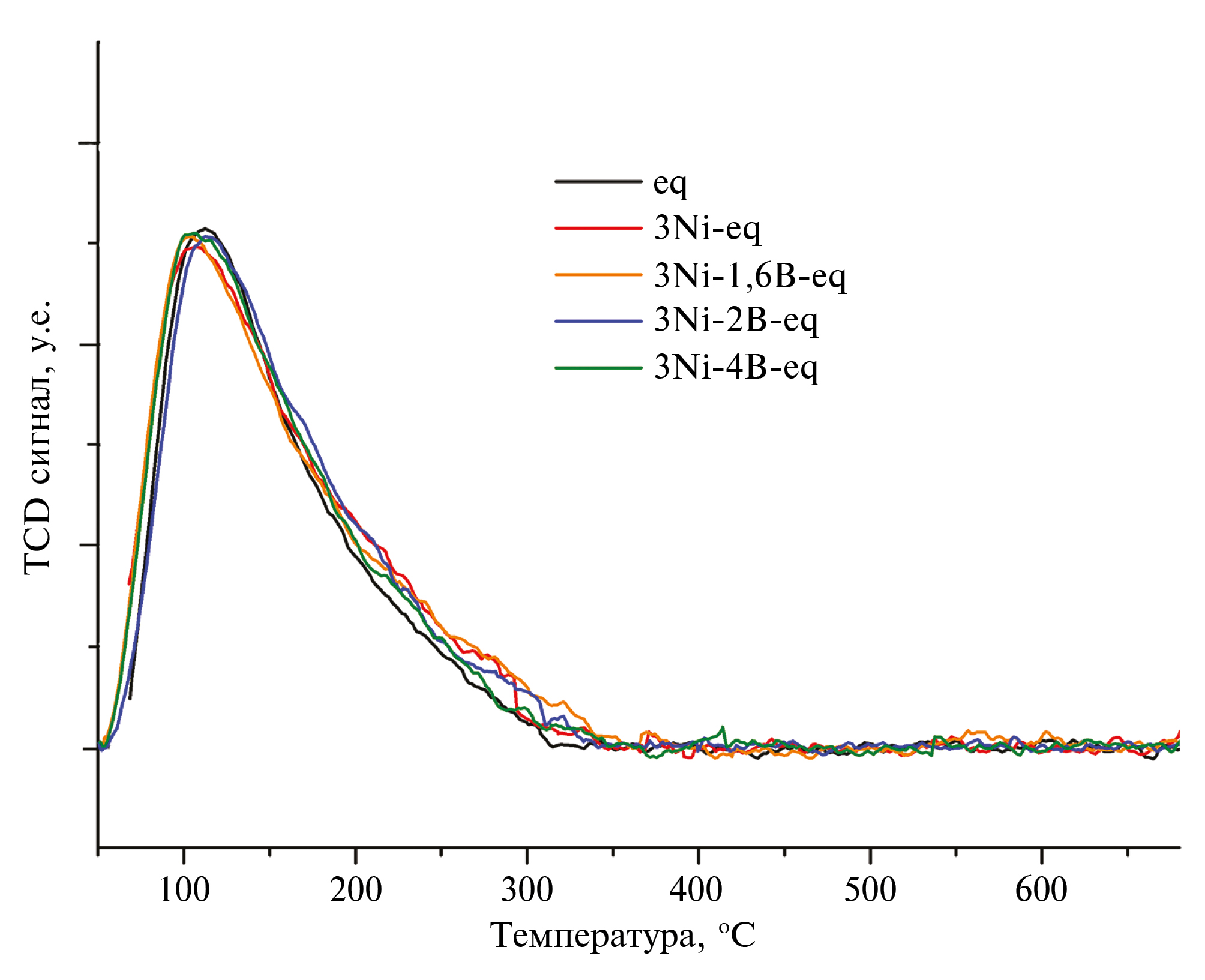Рис. 1. Профили термопрограммируемой десорбции аммиака катализаторов крекинга: eq – равновесный катализатор, 3Ni-eq – катализатор после дезактивации 3470 ppm Ni; далее катализаторы после осаждения пассиватора в процессе крекинга в количестве: 3Ni-1,6B-eq – 1640 ppm B, 3Ni-2B-eq – 1970 ppm B, 3Ni-4B-eq – 3780 ppm B.
