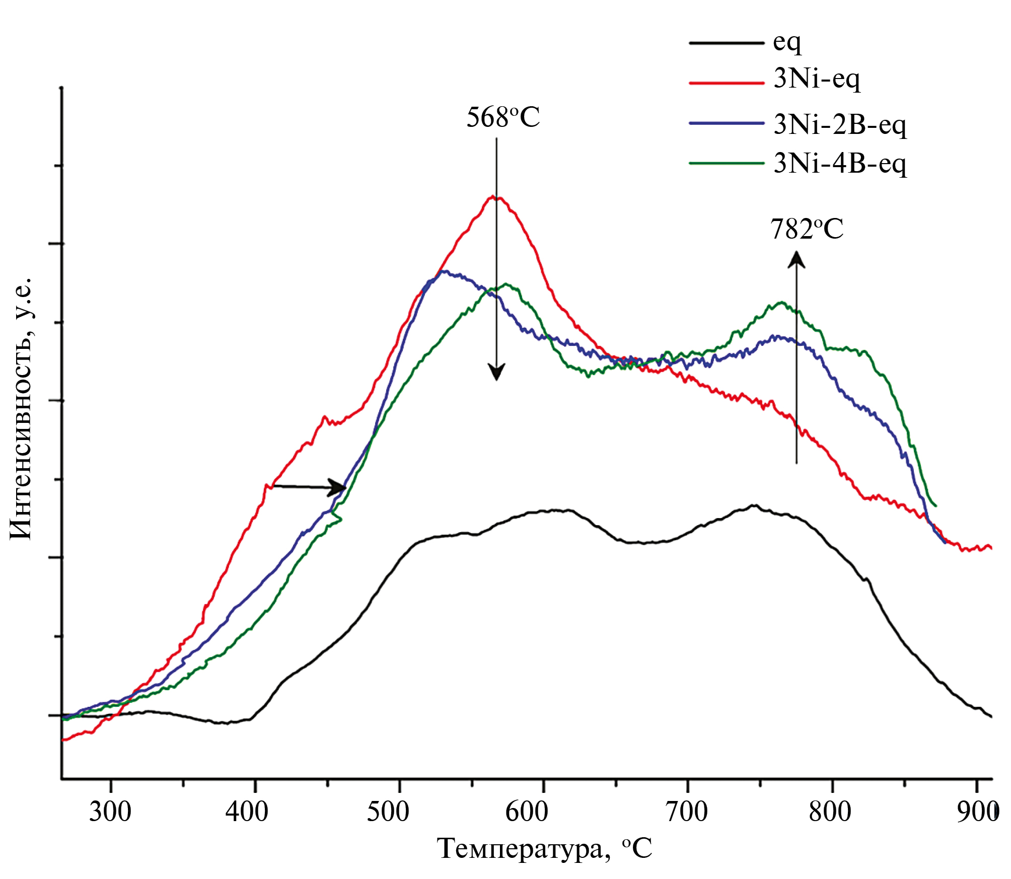 Рис. 2. Кривые температурно-программируемого восстановления водородом катализаторов крекинга: eq – равновесный катализатор, 3Ni-eq – катализатор после дезактивации 3470 ppm Ni; далее катализаторы после осаждения пассиватора в процессе крекинга в количестве: 3Ni-2B-eq – 1970 ppm B, 3Ni-4B-eq – 3780 ppm B.