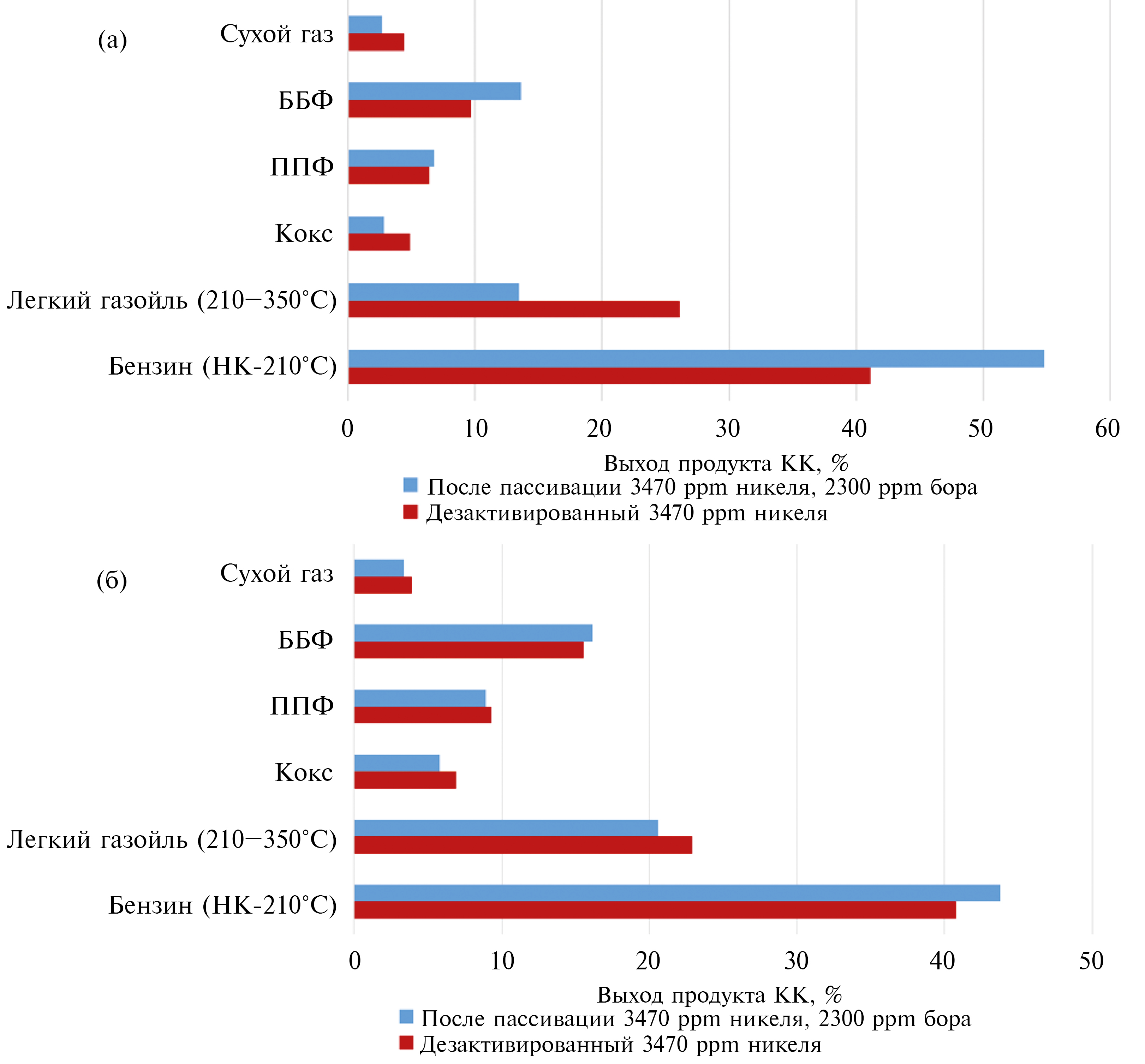 Рис. 3. Характеристики процесса каталитического крекинга гидроочищенного вакуумного газойля на пилотной установке (а) и МАТ-установке (б) в присутствии катализатора после дезактивации 3470 ppm никеля и после пассивации 3470 ppm Ni борсодержащими соединениями в количествах 2300 ppm в пересчете на бор.