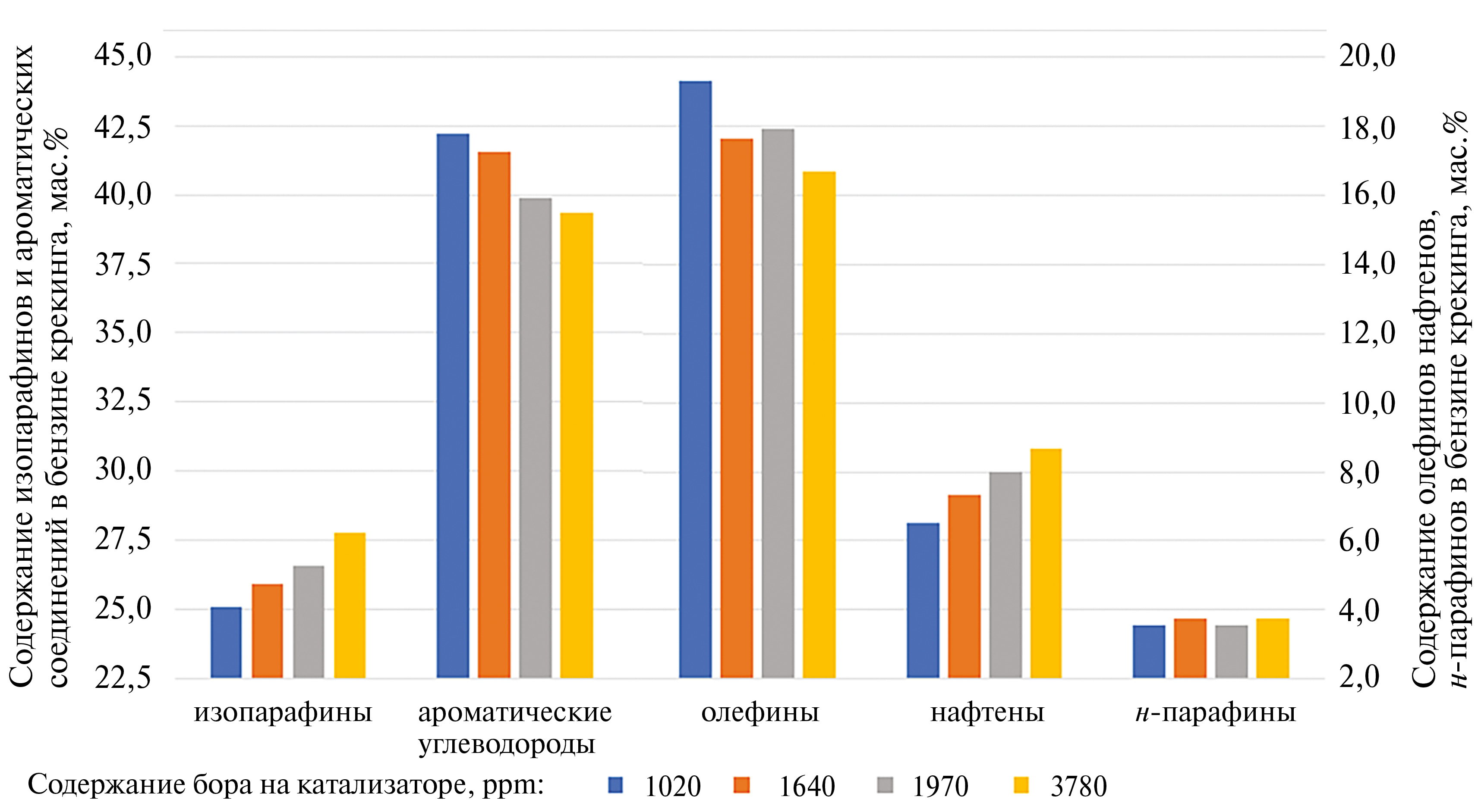 Рис. 5. Групповой состав бензиновых фракций, полученных в результате крекинга гидроочищенного вакуумного газойля ГВГ-2 в присутствии катализатора после накопления пассиватора до уровня 1020, 1640, 1970 и 3780 ppm бора.