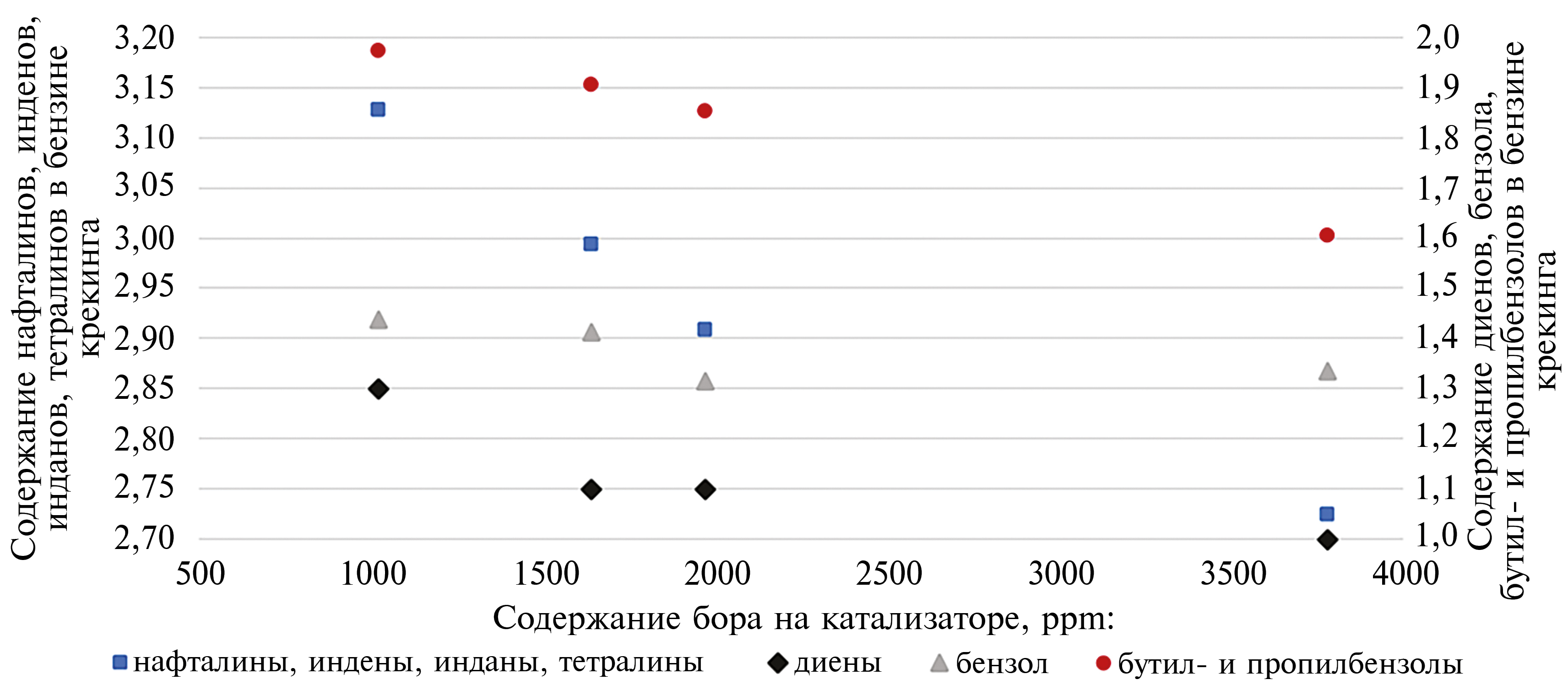 Рис. 6. Содержание нафталинов, инденов, инданов, тетралинов, диенов, бензола, бутил- и пропилбензолов в бензиновых фракциях, полученных в результате крекинга гидроочищенного вакуумного газойля ГВГ-2 в присутствии катализатора после накопления пассиватора до уровня 1020, 1640, 1970 и 3780 ppm бора.