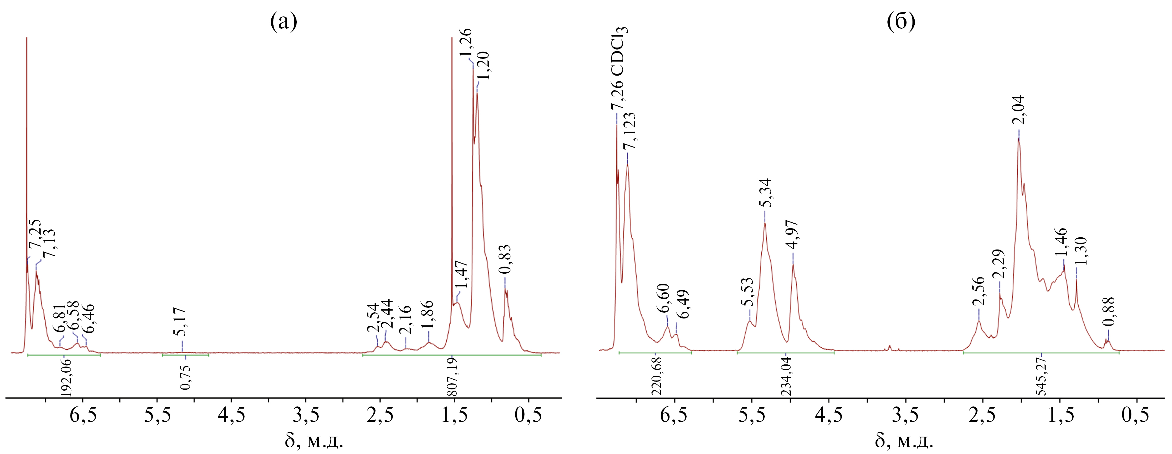 Рис. 1. 1Н-ЯМР-спектры сополимера П2: (а) — до гидрирования и (б) – после гидрирования.