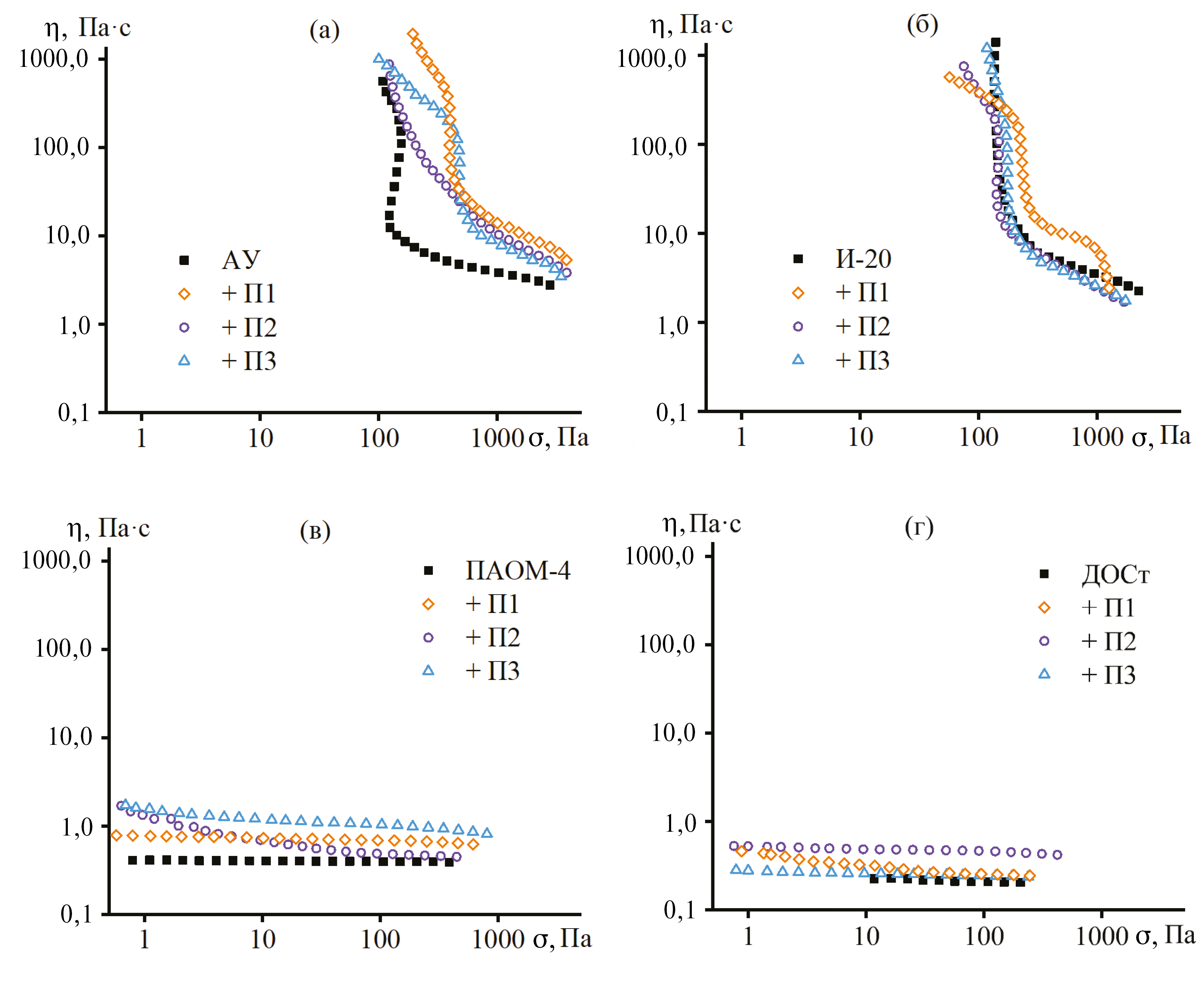 Масла ПАОМ-4 и ДОСт не кристаллизуются при минус 20°C, демонстрируя ньютоновское поведение (рис. 3в и 3г). При этом добавление полимерных присадок во всех случаях повышает вязкость, но не одинаковым образом. В случае сложноэфирного масла рост вязкости происходит сильнее при введении присадки П2, содержащей большее число стирольных звеньев. Возможно, стирольные звенья способствуют большему разворачиванию макромолекул и, как результат, их более высокой вязкости в растворе. Однако это маловероятно, так как можно ожидать, что термодинамическое взаимодействие ДОСт со стирольными звеньями хуже, чем с бутадиеновыми, из-за большей близости параметров растворимости ДОСт (17,5 МПа0,5) и полибутадиена (18,0 МПа0,5), чем ДОСт и полистирола (21,7 МПа0,5 [15]). Иными словами, возможна ассоциация макромолекул через стирольные звенья из-за их плохого взаимодействия с молекулами сложного эфира, способствующая их большей вязкости в растворе.