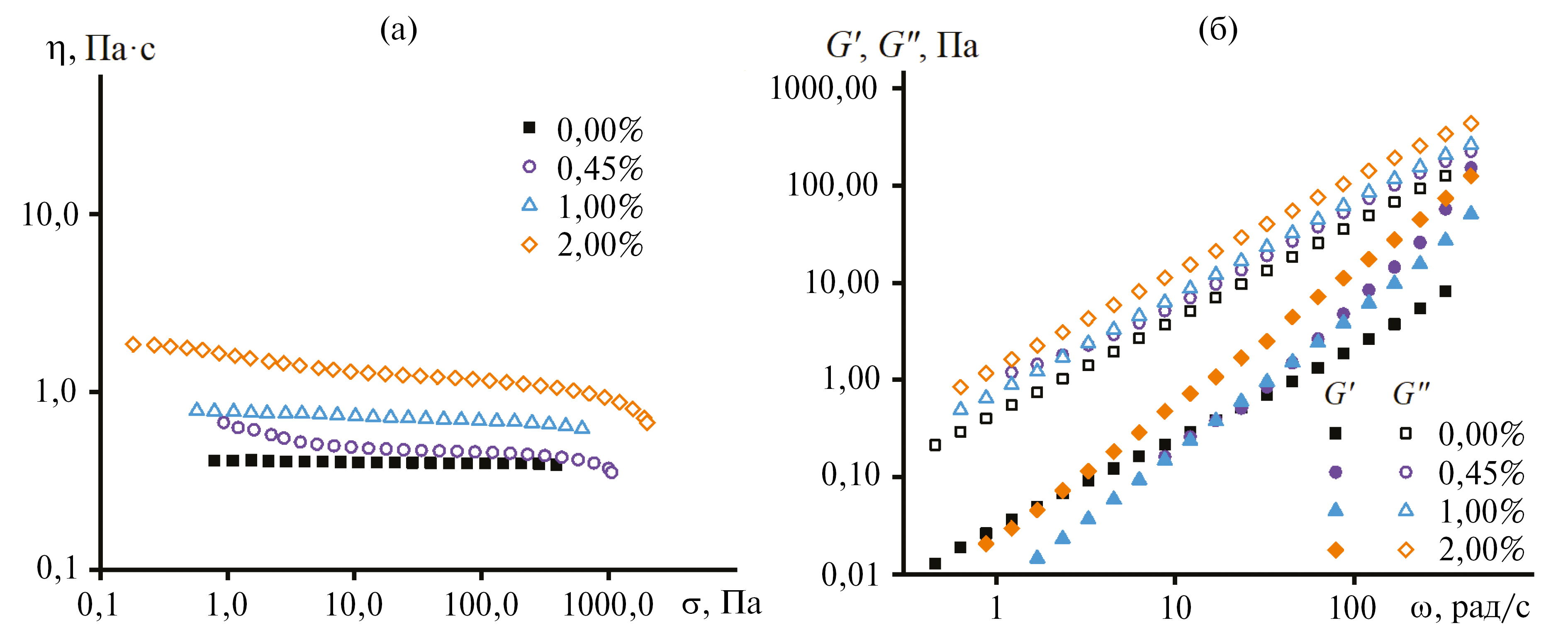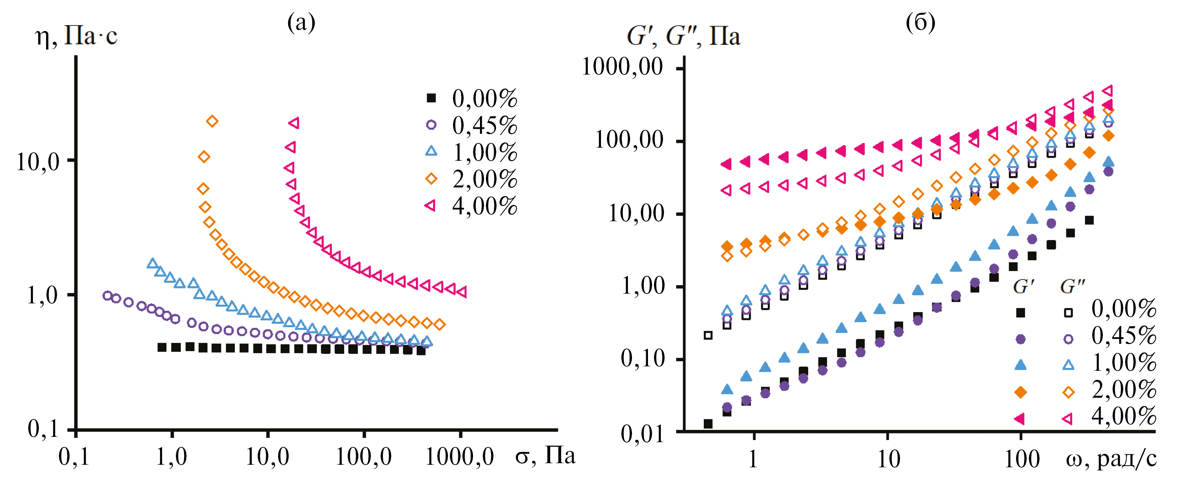 Рис. 5. Зависимости вязкости от напряжения сдвига (а) и модулей накопления и потерь от угловой частоты (б) при –20°C для ПАОМ-4, содержащего разную концентрацию П2.