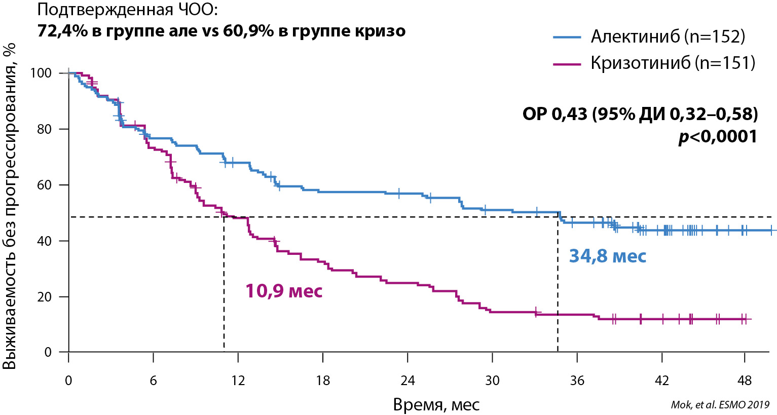 Алектиниб продемонстрировал в этом исследовании колоссальное преимущество и по показателю ОВ. При 5-летнем наблюдении в группе кризотиниба ОВ составила 57,4 мес, а в группе алектиниба она не была достигнута.