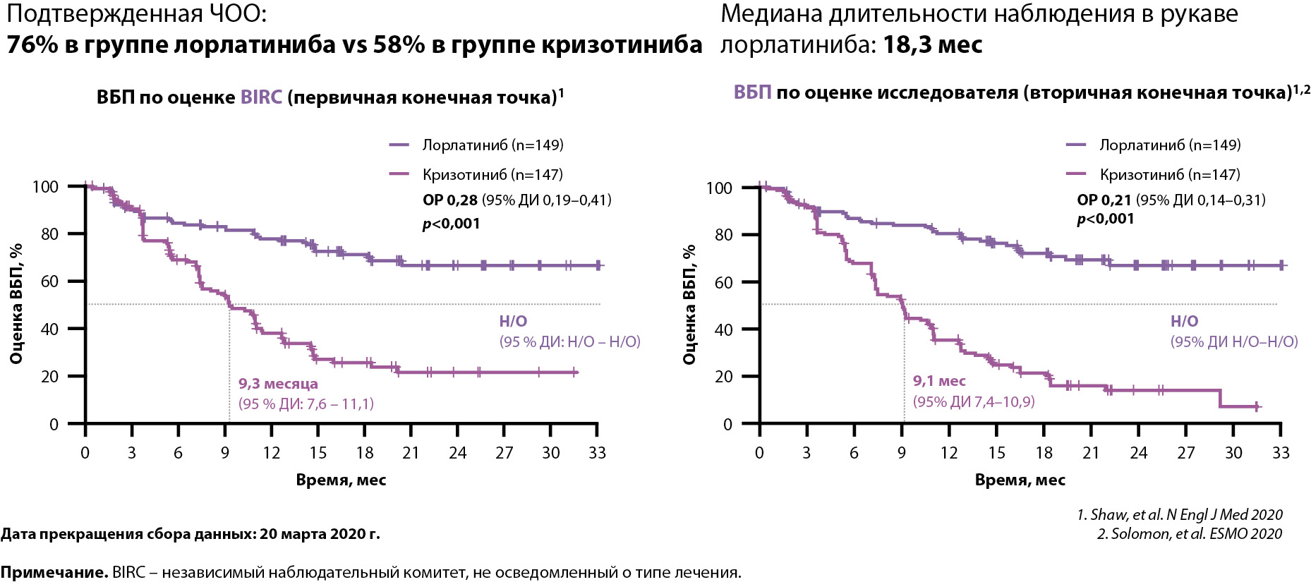 Подтвержненная частота объективного ответа (ЧОО) в группе лорлатиниба составила 86% против 58% в группе кризотиниба. Кроме того, лорлатиниб показал статистически значимую интракраниальную активность в сравнении с кризотинибом – 82% против 23%.