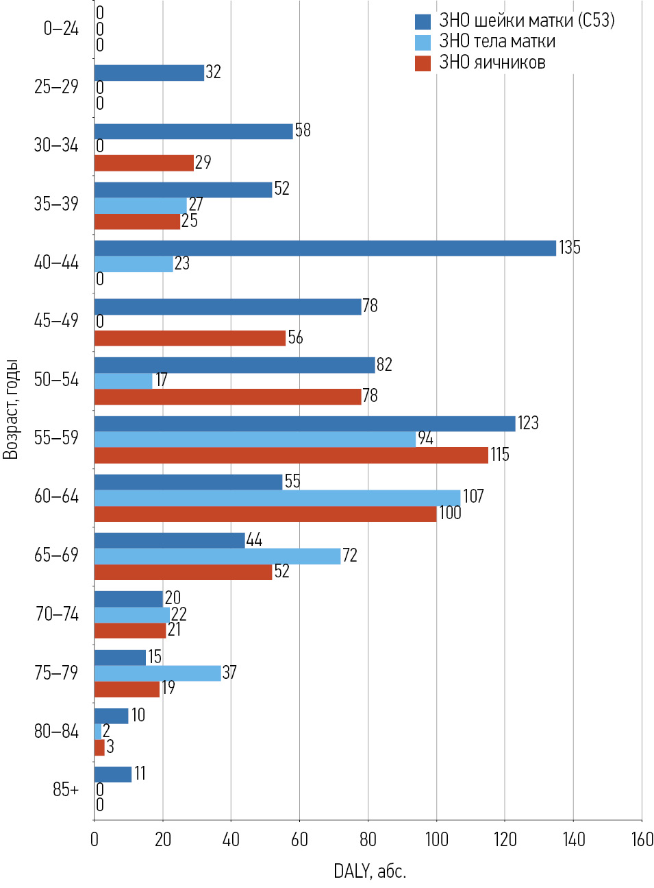 Наибольшие абсолютные потери DALY среди смертельных случаев, причиной которых стали ЗНО шейки матки, пришлись на возрастную группу 40–44 года и составили 135 единиц DALY (19% в общей структуре потерь). Пик потерь от ЗНО тела матки отмечается в возрастной группе 60–64 года и составляет 107 единиц DALY (26,7% в общей структуре потерь). Максимальные потери DALY от ЗНО яичников наблюдаются в возрастной группе 55–59 лет – 115 единиц DALY (23% в общей структуре потерь); рис. 2.
