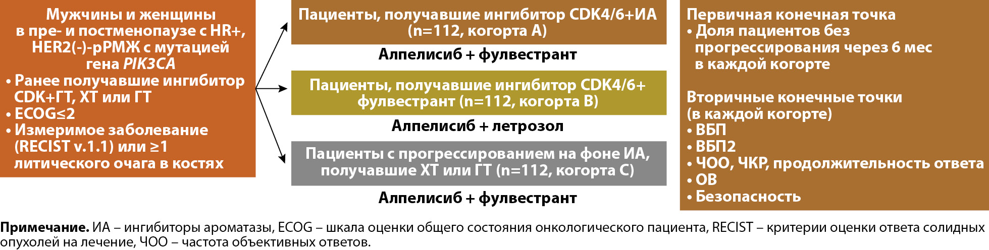 Согласно российским и международным клиническим рекомендациям ингибиторы CDK4/6 являются предпочтительной опцией 1-й линии терапии HR+ HER2(-)-рРМЖ [5–10], поэтому алпелисиб часто назначают при прогрессировании заболевания после терапии ингибитором CDK4/6. Применение алпелисиба у пациентов с мутацией гена PIK3CA после прогрессирования на ГТ, комбинированной с ингибитором CDK4/6, изучали в исследовании II фазы BYLieve (рис. 2) [13].