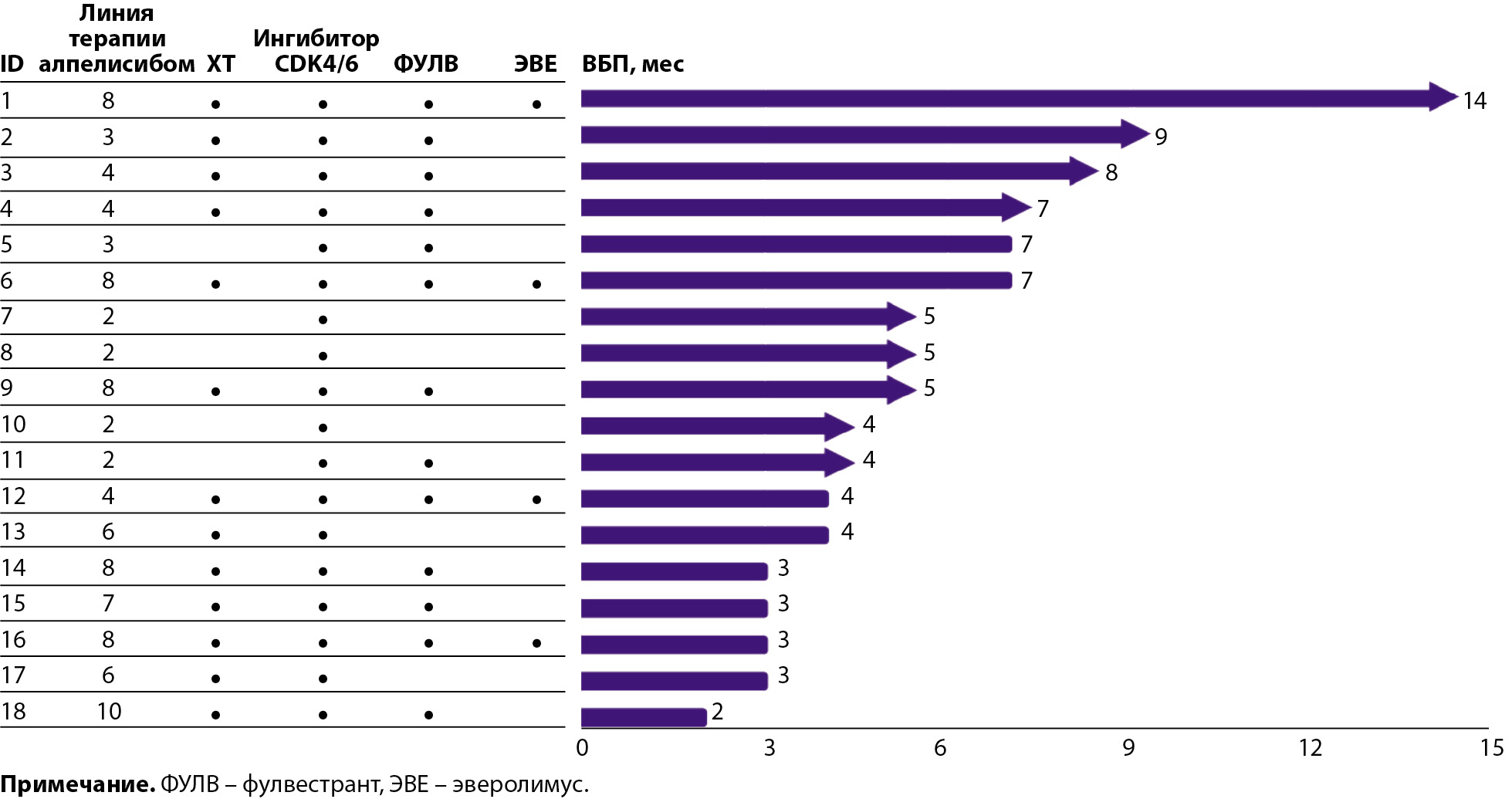 Проф. Л.Г. Жукова рассказала об исследовании эффективности и переносимости алпелисиба у 19 пациенток с HR+ HER2(-)-мРМЖ с мутацией PIK3CA, проходивших лечение в ГБУЗ г. Москвы «МКНЦ им. А.С. Логинова» [21]. В качестве предшествующей терапии 79% пациенток получали ХТ и 21% – ГТ, включая ингибиторы CDK4/6. Абсолютное большинство (68%) пациенток получили алпелисиб с фулвестрантом в 4-й и последующей линиях терапии; во 2 и 3-й линиях алпелисиб получали 21 и 11% пациенток соответственно. Медиана числа линий предшествующей терапии составила 5 (1–9). В этой небольшой когорте больных удалось увидеть 28% объективных ответов, и еще у 50% пациенток – стабилизацию болезни длительностью 6 мес и более. У 22% больных было зарегистрировано прогрессирование болезни. Итак, мВБП составила 7 мес, что сопоставимо с мВБП в когортах А и С в исследовании BYLieve [13, 20], где пациенты получали алпелисиб в 1–3-й линии. Полученные результаты позволяют сделать заключение о том, что алпелисиб эффективен у предлеченных пациенток, получавших ранее разнообразные варианты терапии (рис. 3).