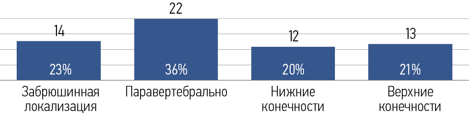 Опухоли располагались паравертебрально в 22 (36%) случаях (шейный, грудной и пояснично-крестцовый отделы составили 1, 6, 15 случаев соответственно), забрюшинно – в 14 (23%), в нижних конечностях – в 12 (20%), в верхних конечностях – в 13 (21%). Распределение больных в зависимости от локализации первичной опухоли отображено на рис. 1. Средний размер опухоли составил 107±30 мм (медиана – 90 мм, минимум – 10 мм, максимум – 450 мм). У больных с НФ-1 (n=11; 18%) средний размер опухоли составил 95 мм, в остальных случаях – 109 мм.