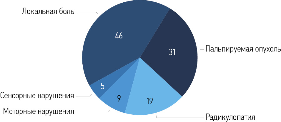 Заболевание протекало бессимптомно у 4 (7%) больных и обнаружено в виде случайной находки (рис. 2). Чаще всего больные обращались в лечебное учреждение по поводу местной боли (n=46; 75%), пальпируемой опухоли (n=31; 51%) и радикулопатии (n=19, 31%). Также наблюдались сенсорные (n=5; 8%) и моторные (15%) нарушения, у 1 больного определялись тазовые расстройства. Интересно, что 2 и более симптомов наблюдалось у 32 (53%) пациентов. Частота проявления симптомов ЗООПН представлена на рис. 3. После оперативного вмешательства радикулопатия наблюдалась у 5 (8%), у 2 (3%) – чувствительные нарушения, у 1 больной сохранилось снижение двигательной активности в правой руке, наблюдавшееся и до операции в том же объеме.