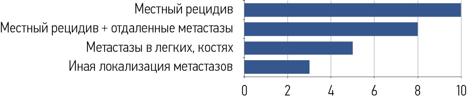 Большинство пациентов – 59 (97%) госпитализированы в связи с первичной опухолью без признаков поражения лимфатических узлов и отдаленных метастазов. У 2 (3%) больных на момент постановки диагноза имелись метастазы в легких, в дальнейшем им проводилось комбинированное лечение (операция + ПХТ). Всего рецидив развился у 26 (43%) больных, при этом наиболее часто наблюдался местный рецидив (n=10; 16%), у 14 (23%) больных при дальнейшем наблюдении обнаружены отдаленные метастазы: в 5 (8%) случаях в легкие, в 8 (13%) в легкие и кости в совокупности с местный рецидивом, в 3 (5%) отдаленные метастазы другой локализации. Тип прогрессирования представлен на рис. 3.