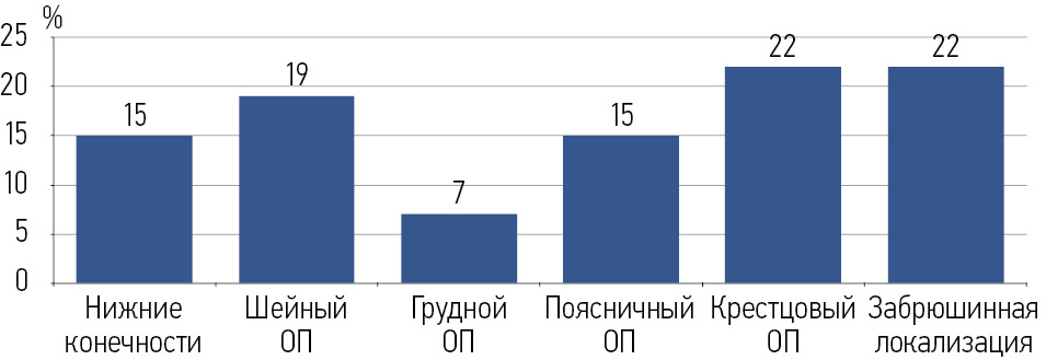 Первичное хирургическое лечение в ФГБУ «НМИЦ онкологии им. Н.Н. Блохина» проводилось у 33 (54%) больных, при этом радикальную (R0) резекцию удалось выполнить в 26 (79%) случаях, местный рецидив развился у 6 (18%). Все 6 больных в дальнейшем повторно прооперированы в нашем центре, при этом в 5 случаях удалось выполнить радикальную (R0) резекцию; 28 (46%) пациентам проведено первичное хирургическое лечение до обращения в ФГБУ «НМИЦ онкологии им. Н.Н. Блохина». Из них местный рецидив развился у 18 (64%) больных. Оперативное вмешательство проводилось в основном в хирургических отделениях по месту жительства. Обращает на себя внимание, что при операциях, выполненных нерадикально, чаще всего опухоли располагались паравертебрально в поясничном (15%) и крестцовом отделах позвоночника – ОП (22%), а также забрюшинно (22%). Реже – в шейном (19%) и грудном (7%) ОП и нижних конечностях (15%). Нерадикально проведенных операций на верхних конечностях в нашем исследовании не отмечено. Количество нерадикальных операций в зависимости от локализации первичной опухоли представлено на рис. 4.