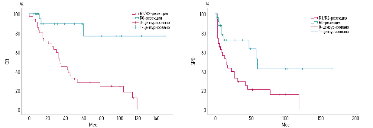 Рис. 5. ОВ и БРВ в зависимости от радикальности хирургического лечения. / Fig. 5. OS and DFS depending on the radicality of surgical treatment.