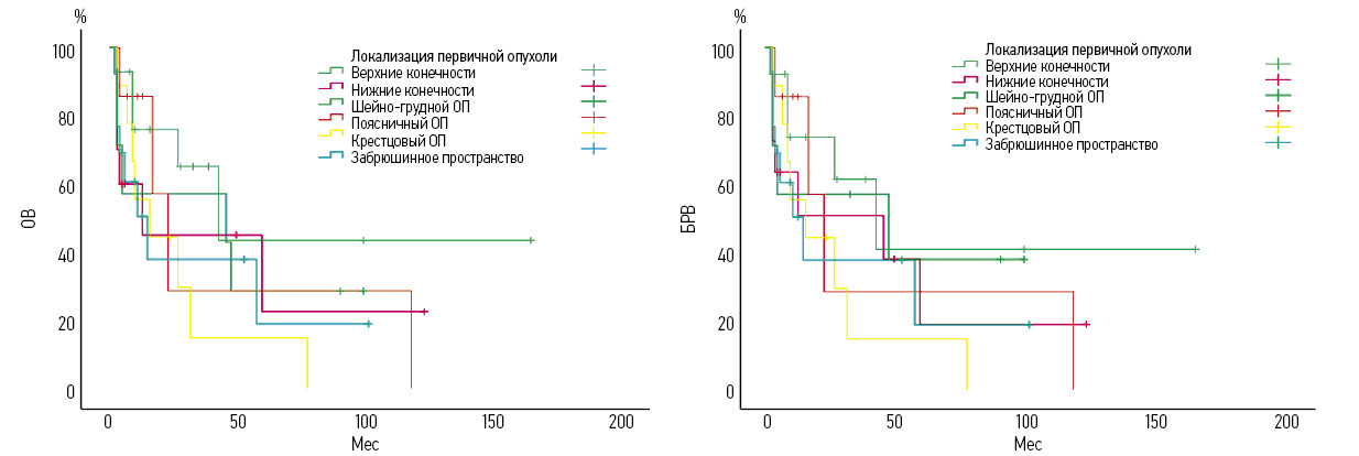 Рис. 6. ОВ и БРВ в зависимости от расположения первичной ЗООПН. / Fig. 6. OS and DFS depending on the location of the primary MPNST.