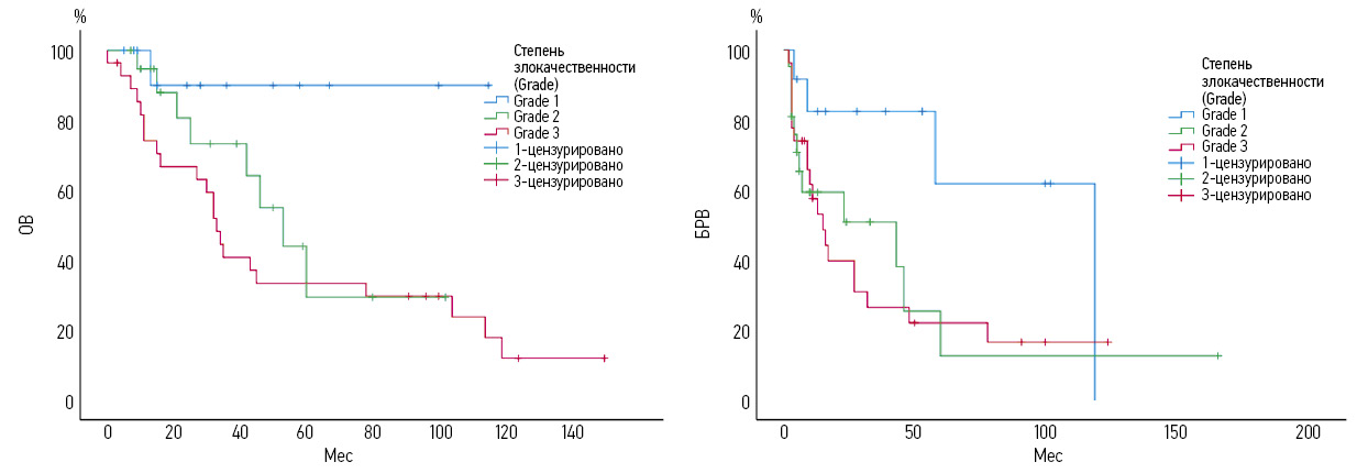Рис. 7. ОВ и БРВ в зависимости от cтепени злокачественности опухоли. / Fig. 7. OS and DFS depending on the degree of tumor malignancy.