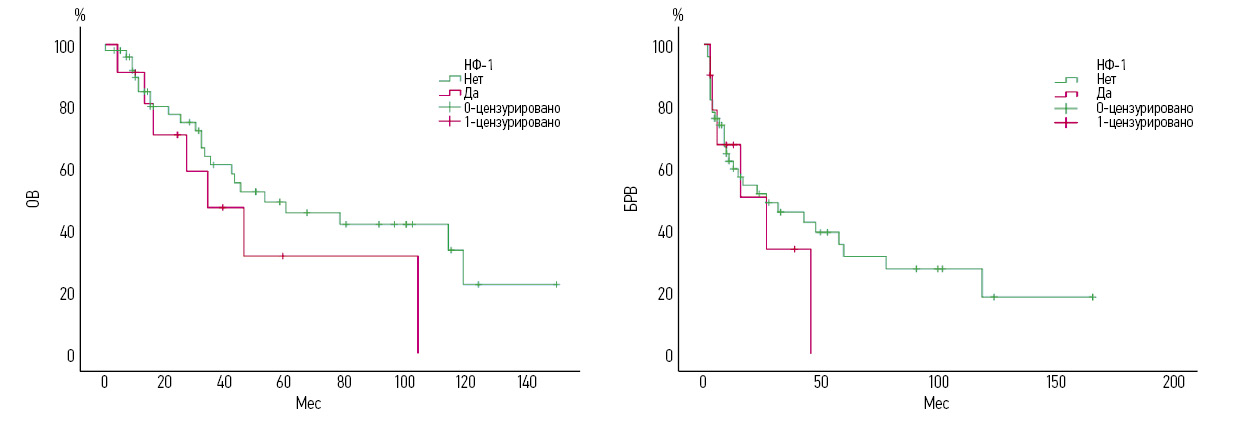 При анализе зависимости степени злокачественности (Grade) опухоли на ОВ и БРВ получены следующие результаты: медиана ОВ при опухолях 1-й степени злокачественности не достигнута, при 2 и 3-й степени злокачественности составила 53 и 33 мес соответственно (p=0,033). Медиана БРВ при опухолях 1, 2 и 3-й степени злокачественности составила 119, 43, 15 мес соответственно (p=0,078). Влияние степени дифференцировки опухоли на ОВ и БРВ отражено на рис. 7. При сравнении ОВ (p=0,244) и БРВ (p=0,512) у больных с ЗООПН в зависимости от статуса НФ-1 также не обнаружено статистически значимых различий (рис. 8). Далее проведено сравнение результатов лечения у пациентов, перенесших первичное хирургическое лечение в референсном центре (ФГБУ «НМИЦ онкологии им. Н.Н. Блохина»), и больных, которым ранее уже выполнены оперативные вмешательства в непрофильных лечебных учреждениях. Проведение операции в специализированном центре демонстрирует существенное различие в показателях БРВ (p=0,033), однако в ОВ (p=0,134) не показало статистически достоверной разницы. Медиана БРВ в группе первичных опухолей составила 78 мес и 42 мес – в группе рецидивных. При анализе ОВ при первичном и рецидивном характере опухолевого процесса медиана составила 43 и 11 мес соответственно.