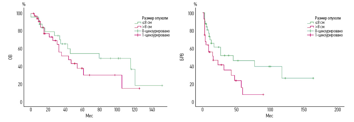Также проанализировано влияние размеров первичной опухоли на показатели ОВ и БРВ. Проводилось разделение больных на 2 подгруппы при размерах опухоли более или менее 8 см (что соизмеримо с медианой размеров ЗООПН). Размеры опухоли достоверно оказывали негативное влияние на БРВ (p=0,032), однако статистически значимой разницы в показателях ОВ (p=0,272) не достигнуто. Медиана ОВ при размерах опухоли 8 см и меньше составила 73 мес и 43 мес – при размере более 8 см. При оценке БРВ медиана составила 46 и 17 мес соответственно (рис. 9).