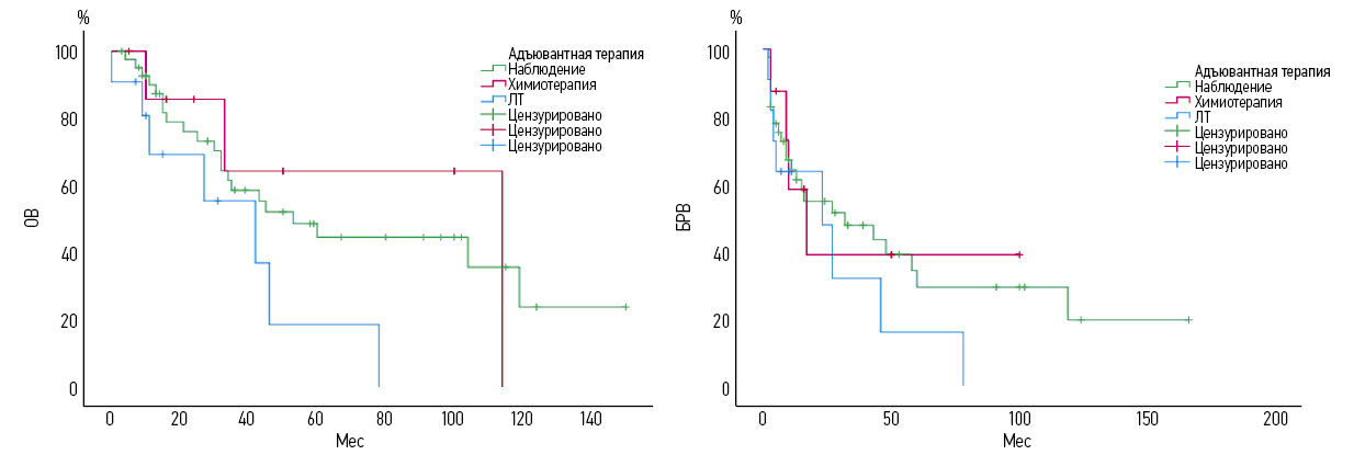 До сих пор проводятся дискуссии относительно периоперационного химиолучевого лечения ЗООПН, причем некоторые работы предполагают ее положительную роль, в то время как другие этого не подтверждают. Мы не обнаружили, что использование НАХТ и адъювантной ЛТ или ПХТ имеет статистически достоверное влияние на отдаленные результаты лечения. Однако такие данные могут быть искажены использованием периоперационного лечения при опухолях высокой степени злокачественности, число которых превалировало в нашем исследовании, а также в условиях, когда достижение радикальных хирургических границ резекции затруднено или невыполнимо. Большинство имеющихся литературных данных также не смогло показать эффективность ЛТ в выживаемости больных с ЗООПН [21, 22]. Единичные сообщения [15] демонстрируют снижение местного рецидивирования при добавлении к операции ЛТ, однако влияния на ОВ при этом не отмечено. В то же время итальянская группа продемонстрировала связь ЛТ и более высокой смертности без влияния на местный рецидив и отдаленные метастазы [17]. В нашем исследовании радиотерапия ассоциировалась с худшей ОВ и БРВ, как мы считаем, в основном из-за использования этого метода при более крупных и агрессивных опухолях.