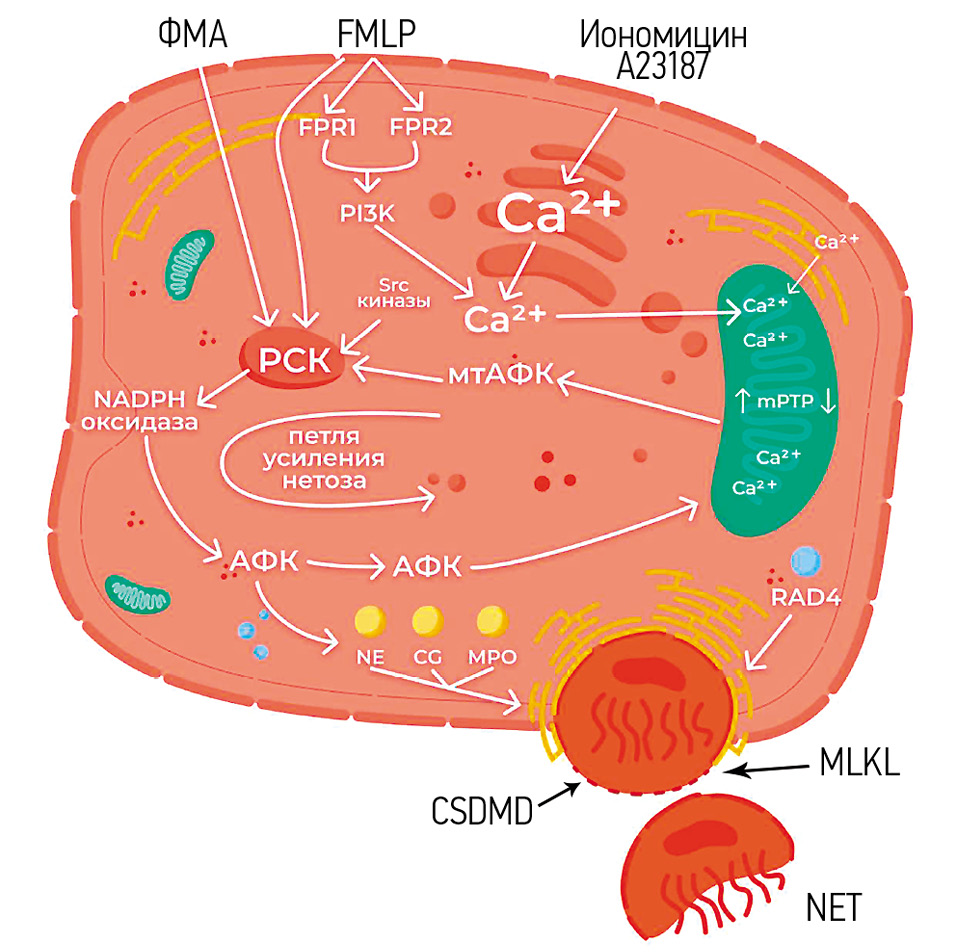 При участии протеинкиназы С (РКС) митохондриальные АФК (мтАФК) стимулируют NADPH-оксидазу [5], а внутриклеточные киназы (семейство Src-киназ), стимулирующие РКС, активируются под действием АФК [6]. В исследовании N. Vorobjeva и соавт. [7] продемонстрировано повышение активности мтАФК и NADPH-оксидазы за счет сигнала от G-белок-связанного рецептора формилметионил- лейцил-фенилаланина (fMLP), который индуцирует освобождение Ca2+ из внутриклеточного депо, а также Ca2+-независимую активацию фосфоинозитид-3-киназы (PI3K). Ca2+-зависимая активация образования мтАФК может служить одним из основных источников АФК в случае индукции формирования НВЛ, вызванного, в частности, иономицином [8]. Эти данные также подтверждают, что возможны два разных механизма НЕТоза, один из которых не зависит от NADPH-оксидазы [9]. Генерация мтАФК, вызванная fMLP (формилметионил-лейцил-фенилаланин, бактериальный пептид) и А23187 (кальцимицин, ионофор кальция), напрямую зависит от открытия митохондриальной поры (mPTP) [10]. Интересно, что при активации НЕТоза под действием fMLP не происходило набухания митохондрий, характерного для длительного открытия митохондриальных пор. Возможно, что в данном случае происходило кратко- временное открытие поры, вызванное повышением концентрации ионов кальция (Са2+) в цитоплазме [10]. Напротив, при активации НЕТоза под действием А23187, который также зависел от открытия mPTP, наблюдалось набухание митохондрий, которое совпадало с деконденсацией хроматина и разрушением ядерной оболочки [10]. Высокая концентрация цитоплазматического Ca2+, образующаяся под действием кальциевого ионофора А23187, привела к продолжительному открытию mPTP. Это повлекло за собой образование больших концентраций мтАФК из-за выхода из митохондрий основных компонентов антиоксидантной защиты [10]. Таким образом, условия формирования НВЛ зависят от типа инициирующего агента.