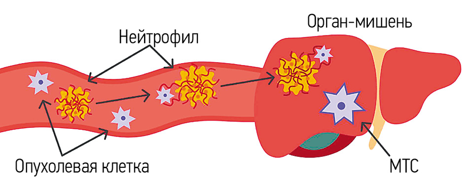 Возможные механизмы участия НВЛ в метастазировании могут быть различны. Предполагают, что нейтрофильные ловушки могут притягивать циркулирующие опухолевые клетки в ткани либо увеличивать проницаемость сосудов, тем самым облегчать экстравазацию опухолевым клеткам [4]. В одном из исследований показано, что воспаление в легких и, соответственно, привлечение в очаг воспаления нейтрофилов с образованием НВЛ может активировать единичные «спящие» раковые клетки и приводить к формированию клинически значимых легочных метастазов [45].