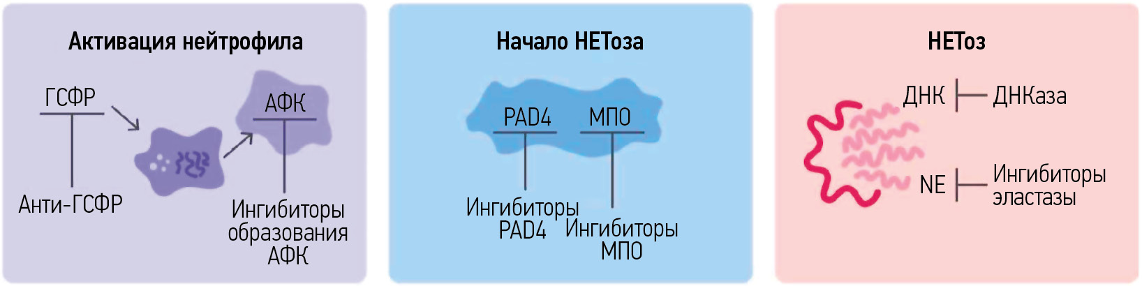Большая часть препаратов, подавляющая образование НВЛ, также подавляет механизмы иммунной системы в целом. Поэтому актуален поиск наиболее эффективных и безопасных агентов, предотвращающих развитие феномена НЕТоза. Одним из возможных препаратов может являться, например, иммуномодулятор со свойствами иммуноадъюванта – азоксимера бромид, который в экспериментальных исследованиях in vitro показал способность ингибировать образование НВЛ и НЕТоз на поздних стадиях [55]. Как сказано, он одновременно играет защитную роль и является одним из ключевых механизмов патогенеза многих заболеваний.