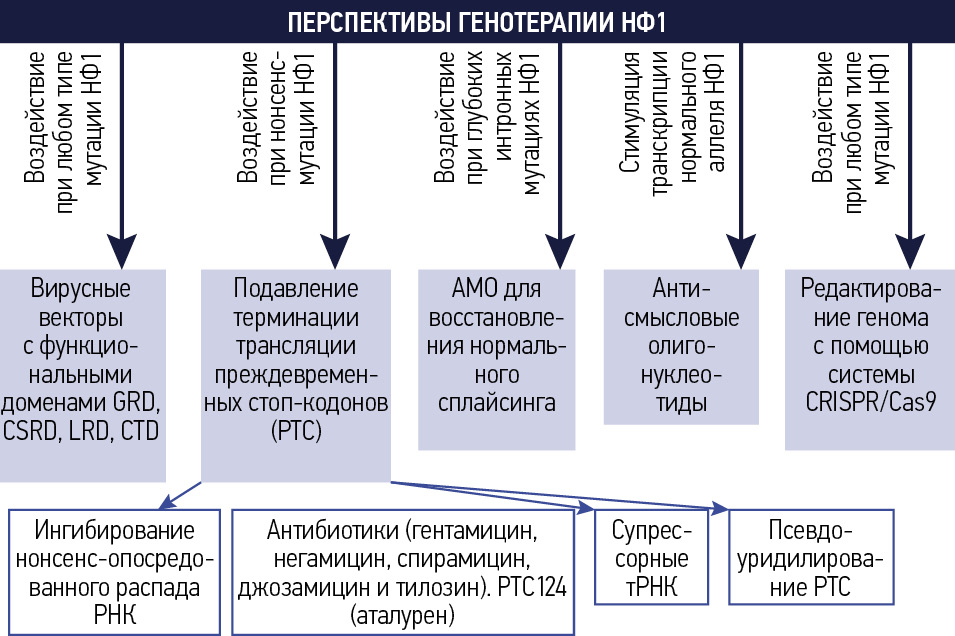 Этиотропное лечение НФ1 без редактирования генома может включать в себя введение полноразмерного нормального гена NF1 с использованием рекомбинантного аденоассоциированного вируса (rAAV), содержащего кассету экспрессии для замены мутантных аллелей и восстановления функции нейрофибромина. Однако вследствие больших размеров кДНК гена NF1 (8500 п. н.) использование стандартных векторных систем доставки не представляется возможным. Поэтому в качестве альтернативы могут применяться усеченные варианты гена NF1, сохраняющие функциональные домены [32]. В 2019 г. на клеточных линиях MPNST и клеток Шванна человека показана эффективность восстановления RAS-ГТФазной активности за счет экспрессии GRD с использованием панели векторов аденоассоциированного вируса (AAV). В результате происходило выраженное подавление RAS специфичным для NF1 путем [1]. Путем трансфекции изолированных доменов GRD, CSRD, LRD, CTD белка нейрофибромина в эксперименте на линии клеток нейрофибромы частично восстановлена нормальная функция клеток. Более того, последовательности рекомбинантного трансгена могут быть сконструированы для кодирования усеченных функциональных белков, которые легко упаковываются в вирусные векторы [33]. Можно надеяться, что полученные результаты станут основой для внедрения в клинику генотерапии НФ1, поскольку для ряда моногенных болезней данный способ лечения показал свою эффективность.