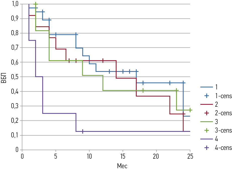 Медиана ВБП составила 12 мес (95% ДИ 8–22), данные представлены на рис. 1.