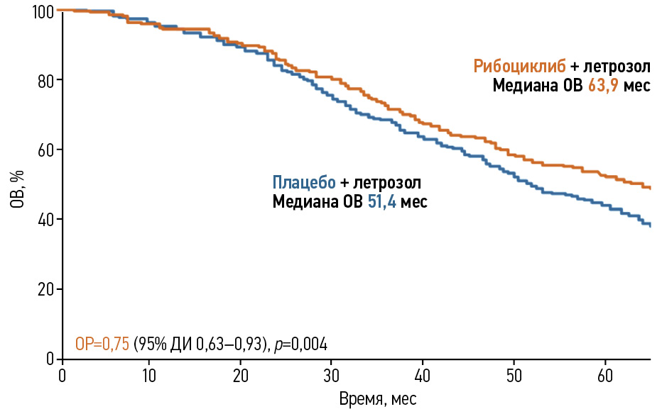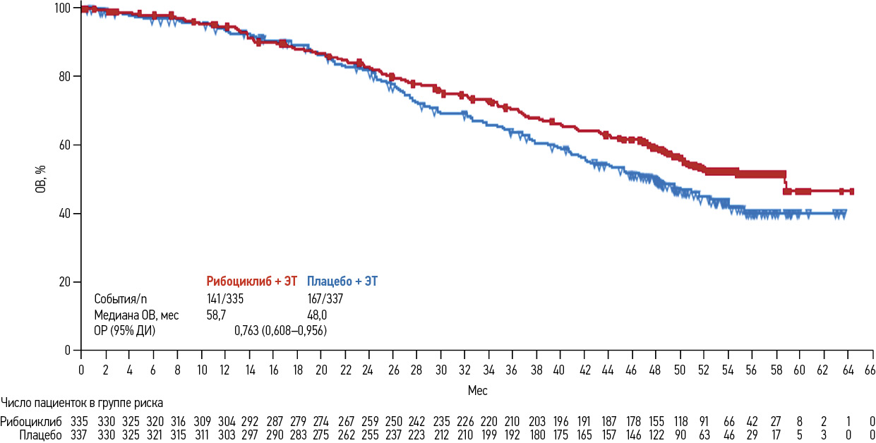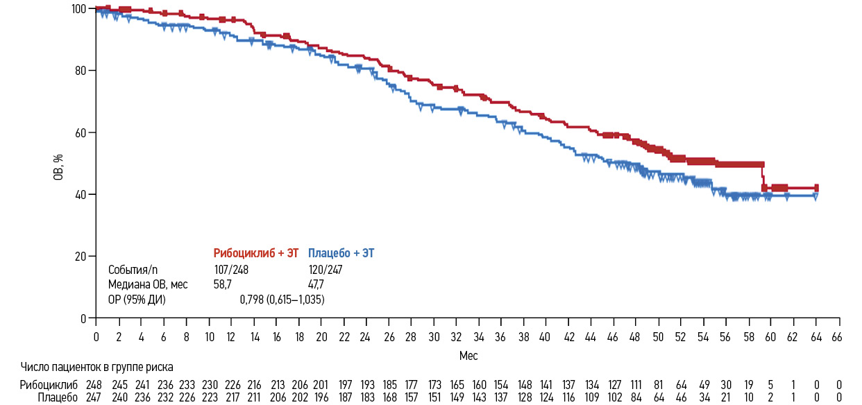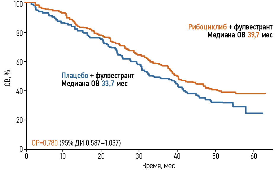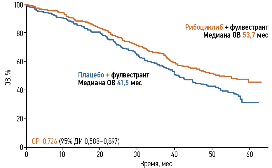 Первые данные по ОВ в общей популяции (1+2-я линии) были получены при медиане наблюдения 40 мес. В группе пациентов, получавших рибоциклиб с фулвестрантом, медиана ОВ не была достигнута по сравнению с группой плацебо + фулвестрант, где медиана ОВ составила 40,0 мес (ОР 0,72, 95% ДИ 0,57–0,92; p=0,00455) [35, 36].