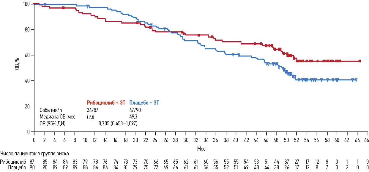 В подгрупповом анализе также произведена оценка ОВ у пациенток с заболеванием de novo [без предшествующей (нео)адъювантной ЭТ/химиотерапии и без предшествующей ЭТ/химиотерапии при распространенном РМЖ, за исключением короткого периода, разрешенного протоколом]. Медиана ОВ не была достигнута в группе рибоциклиба и составила 49,6 мес в группе плацебо (ОР 0,53, 95% ДИ 0,36–0,79) [33, 34].