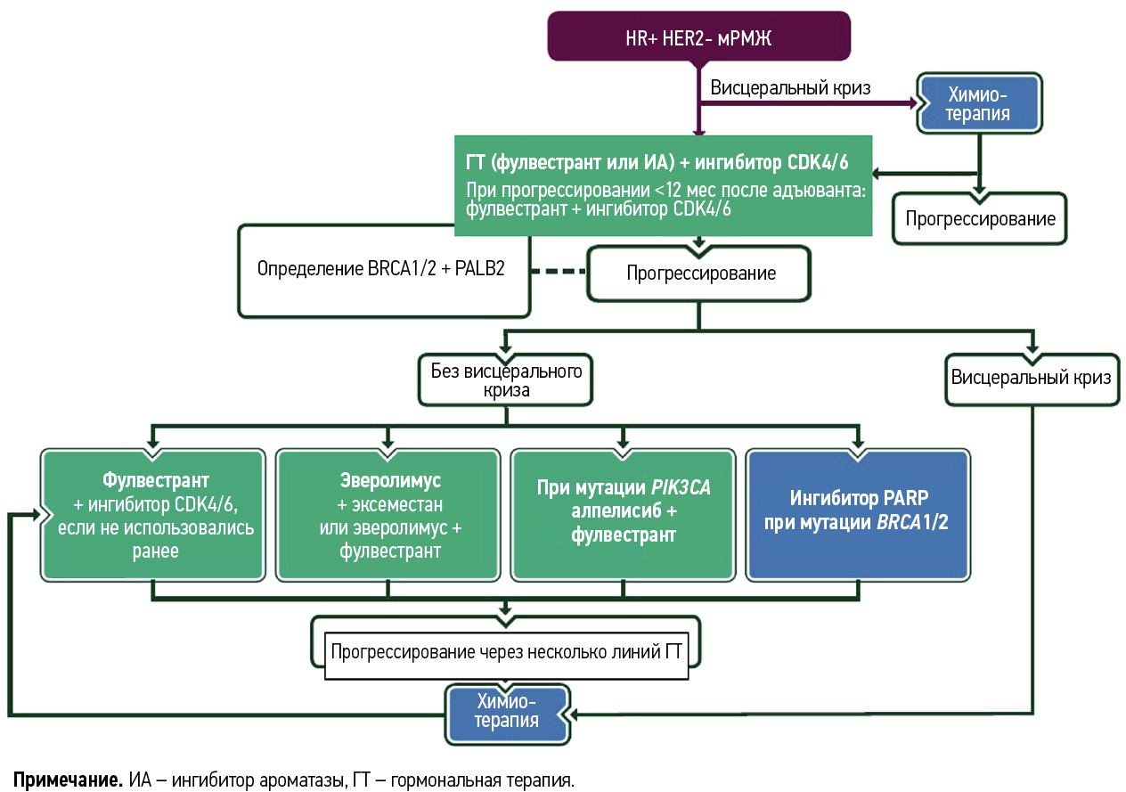 Появление нового класса препаратов – ингибиторов CDK4/6 позволило пересмотреть алгоритм лечения пациенток с HR+/HER2- метастатическим РМЖ. На сегодня в 1-й и во 2-й линиях лечения предпочтительно использование комбинации ингибиторов CDK4/6 c ЭТ (рис. 7) [45].