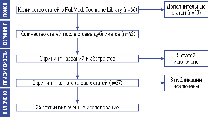 Рис. 1 демонстрирует проведенный поиск в базах данных PubMed и CochraneLibrary, по результатам которого отоб- рано 66 исследований, еще 10 работ найдено путем дополнительного поиска в источниках литературы. После отсева дубликатов для дальнейшего анализа доступно 42 статьи. После скрининга названий и абстрактов исключено 5 статей. Наконец после просмотра полнотекстовых статей в итоговый систематический обзор включено 34 исследования, соответствующих критериям включения [12–45].