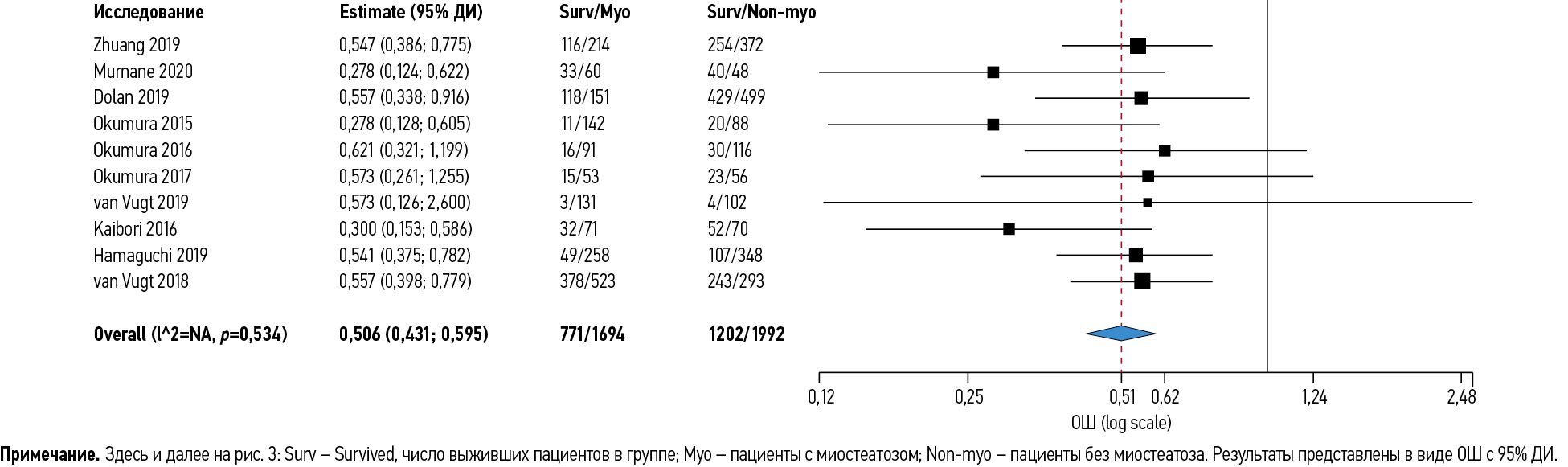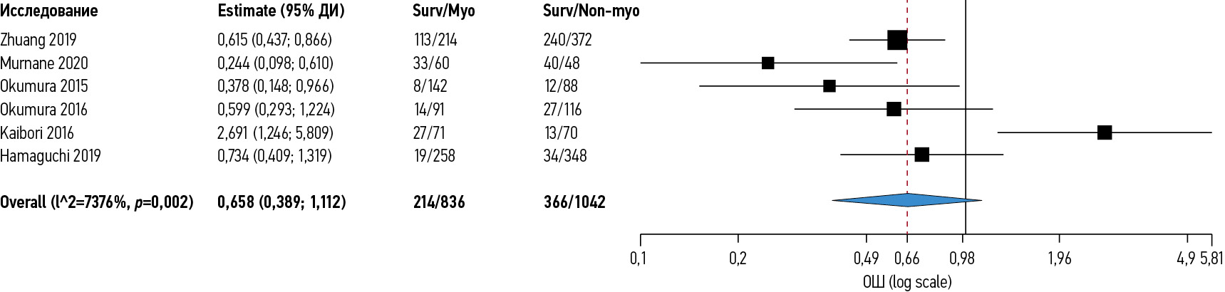 Статистический анализ проводился для оценки влияния миостеатоза на ОВ и ВБП. Метаанализ проведен при помощи свободно распространяемого программного обеспечения OpenMetaAnalyst [10]. При расчетах применялся метод сравнения абсолютных значений 5-летних показателей ОВ и ВБП у пациентов при наличии и без миостеатоза.