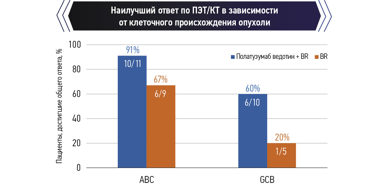 Пациенты рандомизированы в 2 группы (рис. 3). Полатузумаб ведотин в дозе 1,8 мг/кг в комбинации с BR в сравнении с терапией только BR увеличил более чем в 2,5 раза ВБП и более чем в 2 раза ОВ (рис. 4, 5). CD79b экспрессируется практически на всех В-лимфоцитах, он является универсальной мишенью. Поэтому иммуноконъюгат с анти-CD79b эффективен как при АВС-, так и при GCB-типе ДВКЛ, т.е. возможность его применения не зависит от клеточного происхождения опухоли и не требует предварительного тестирования или молекулярных исследований. Общий ответ в группе полатузумаба ведотина + BR достоверно выше по сравнению с группой BR (рис. 6).