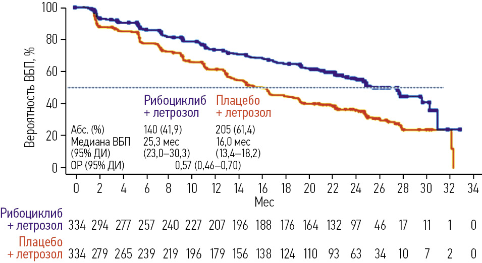 Медиана ВБП в исследовании составила 25,3 мес (95% доверительный интервал – ДИ 23,0−30,3) в группе рибоциклиба против 16,0 мес (95% ДИ 13,4−18,2) контрольной группы (рис. 1) [22]. Таким образом, медиана увеличивалась на 9,3 мес, а относительный риск прогрессирования снижался на 43% (отношение рисков – ОР 0,568, 95% ДИ 0,46−0,70) [8].