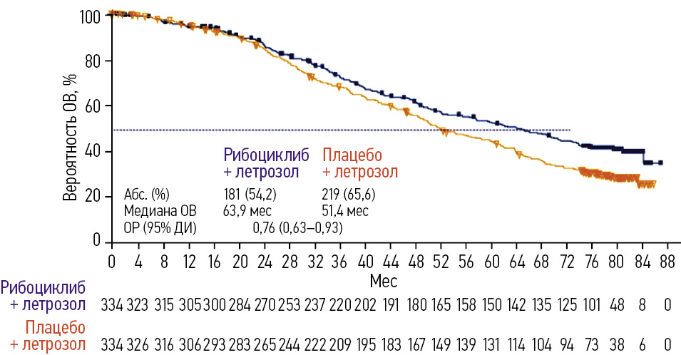 Преимущества по ВБП и ЧОО реализовались и в отношении увеличения ОВ (рис. 2). Представленные в 2021 г. результаты демонстрируют увеличение медианы ОВ в группе рибоциклиба на 12,5 мес: 63,9 мес против 51,4 мес при медиане наблюдения в 80 мес. Относительный риск смерти снижается на 24%: ОР 0,76, 95% ДИ 0,63−0,93; p=0,004 [19]. Примечательно, что с течением времени преимущество в выживаемости при терапии рибоциклибом нарастало: 4-летний анализ показал разницу ОВ в 5,0%, 5-летний – в 8,4%, а 6-летний – 12,2% (живы 44,2% пациенток из экспериментальной группы и 32% в контрольной).