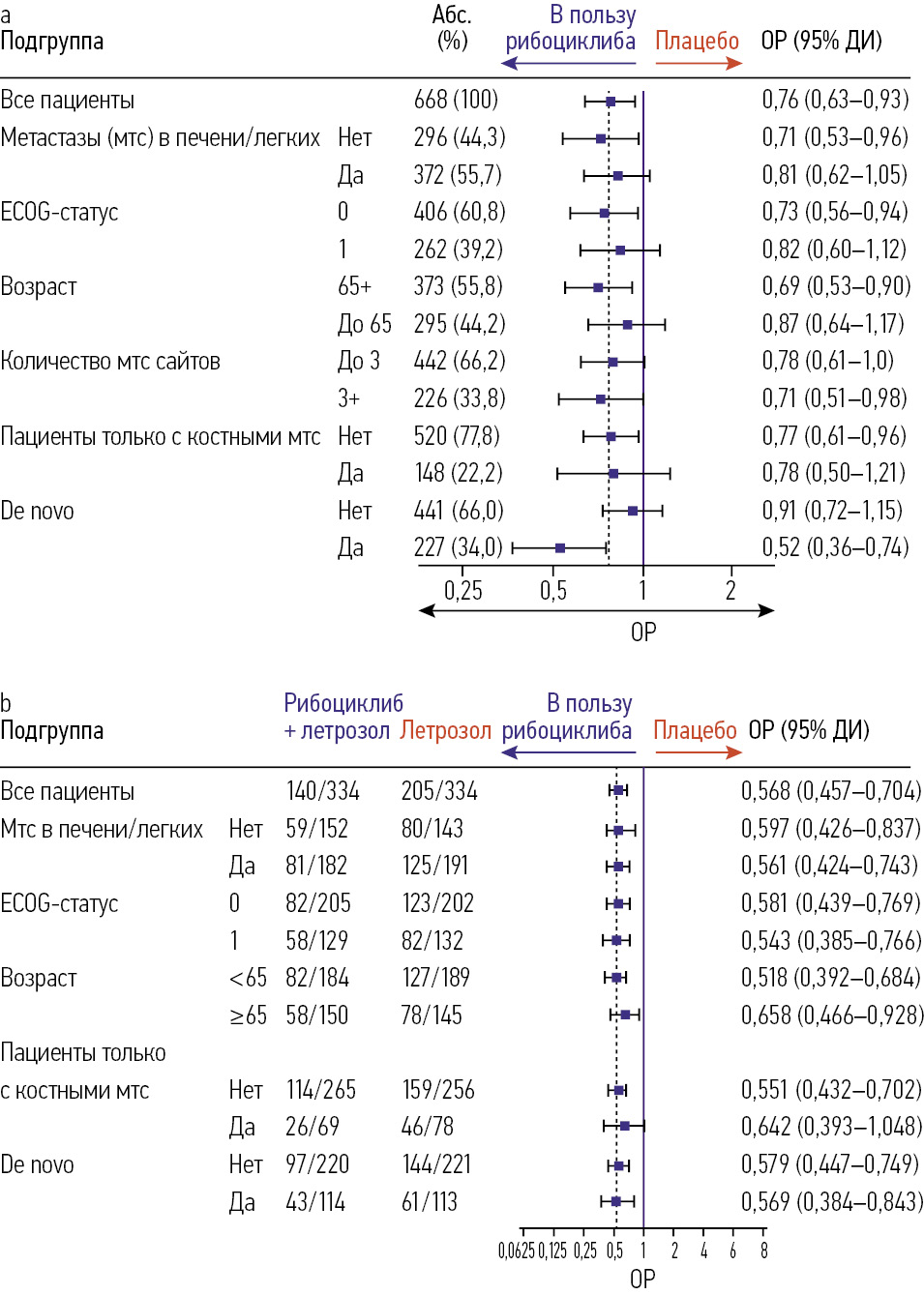 Рис. 3. Фрагменты forest-plot подгруппового анализа ВБП (a) и ОВ (b) в исследовании MONALEESA-2 [19, 23]. / Fig. 3. Fragments of forest-plot subgroup analysis of PFS (a) and OS (b) in the MONALEESA-2 study [19, 23].