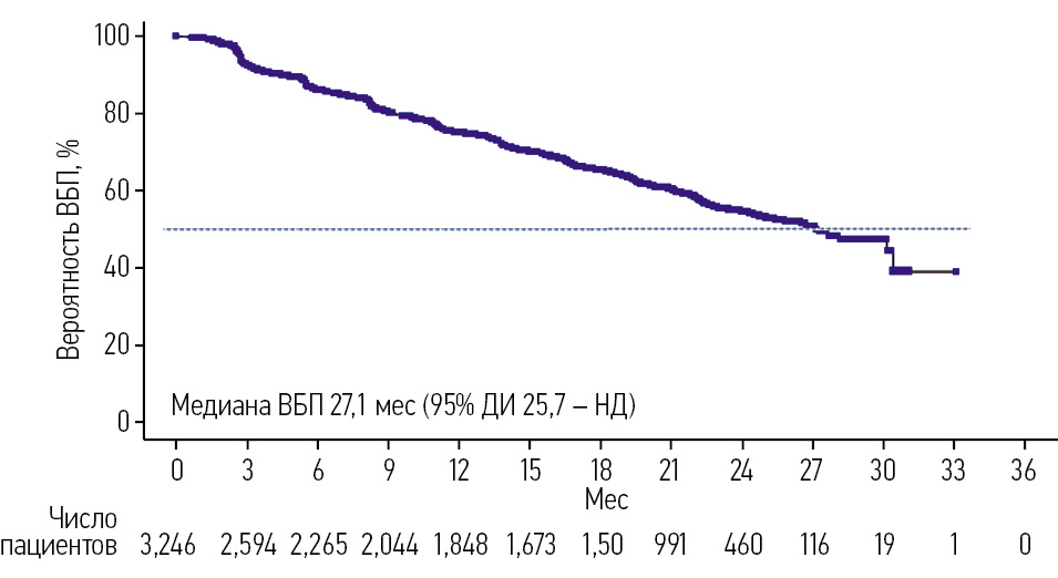 При медиане наблюдения 25,4 мес медиана ВБП составила 27,1 мес (95% ДИ 25,7−НД), а вероятность отсутствия признаков прогрессирования болезни на момент 24 мес составила 54,7% (95% ДИ 52,5−56,8); рис. 4. Полученные результаты оказались сопоставимы с результатами MONALEESA-2 (25,3 мес) и MONALEESA-7 (23,8 мес) [8, 29].