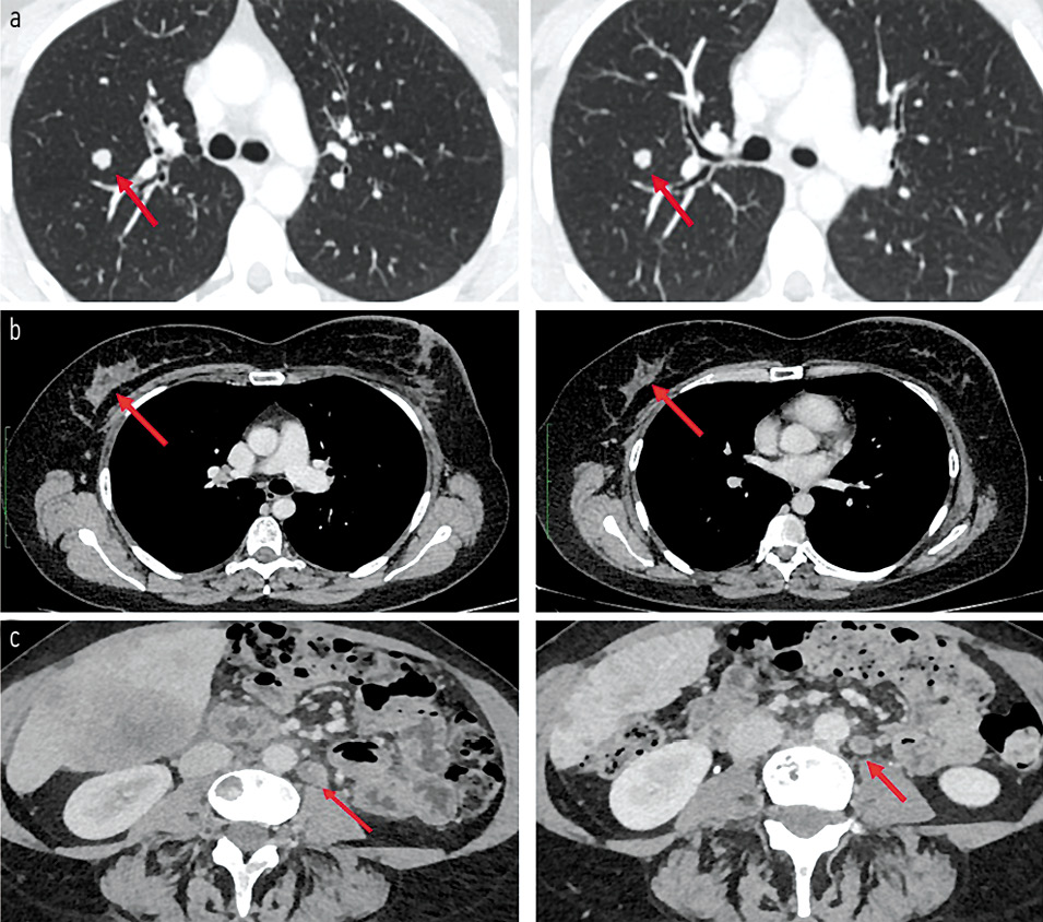 Рис. 5. КТ-снимки, выполненные до начала лечения и после 30 циклов. Красными стрелками отмечены опухолевые очаги: a – метастаз в легком, b – первичная опухоль в молочной железе, с – метастатический лимфатический узел. / Fig. 5. CT scans before treatment and after 30 cycles. Red arrows indicate tumor foci: a – metastasis in the lung, b – primary tumor in the breast, c – metastatic lymph node.