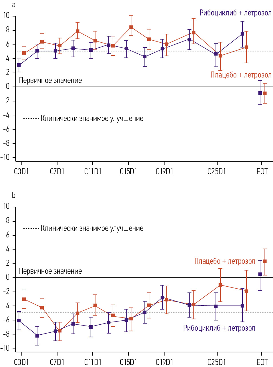 В исследовании MONALEESA-7 показатели являлись сходными: время до ухудшения состояния на 10% значительно удлинялось при добавлении рибоциклиба: 35,8 мес против 23,3 мес соответственно (ОР 0,67, 95% ДИ 0,52−0,86). Также отмечено снижение интенсивности болевого синдрома уже через 8 нед терапии [29, 51].