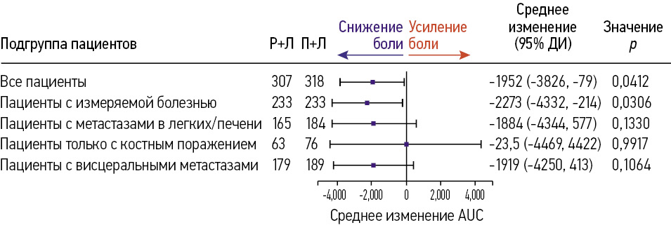Для того чтобы достоверно оценить эффективность комбинации в снижении болевого синдрома, на протяжении всего исследования проведен эксплораторный анализ. Среднее изменение AUC составило -1952 в пользу рибоциклиба (95% ДИ -3826−-79; р=0,0412), что подтверждает данные опросника EORTC QLQ-C30 [43]. При подгрупповом анализе отмечено, что снижение болевого синдрома достигнуто в различных подгруппах пациенток, в том числе при наличии висцеральных метастазов или изолированно костных метастазов (рис. 7).