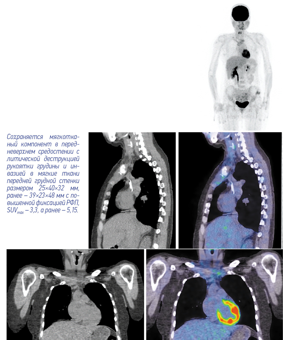 Согласно результатам ПЭТ/КТ, лимфоузлы шеи не увеличены, без повышенной метаболической активности. На уровне щитовидной железы патологически измененной ткани не определяется. Тем не менее в передневерхнем средостении имеется мягкотканый компонент с литической деструкцией рукоятки грудины и инвазией в мягкие ткани передней грудной стенки размером 40×32 мм по сравнению с 23×48 мм в предыдущем исследовании, с повышенной фиксацией РФП, SUVmax – 3,3 (рис. 3, 4). Кроме того, отмечается снижение фиксации РФП во вторичных очагах на фоне литической перестройки костной ткани в грудинных концах ключиц, грудине, крыле левой и правой подвздошной кости, грудных позвонках, головке правой плечевой и левой бедренной кости.