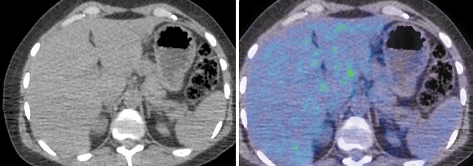 Рис. 4. Пациентка Б., 41 год. ПЭТ/КТ с 18F-ФДГ по окончании 6 циклов полихимиотерапии. На аксиальных КТ- и ПЭТ/КТ-проекциях образование в области медиальной ножки левого надпочечника не определяется, регрессировало. / Fig. 4. Female patient B., 41 years old. PET/CT with 18F-FDG at the end of 6 cycles of polychemotherapy. Axial CT and PET/CT views showed no mass in the area of the left adrenal gland medial limb; the mass regressed.
