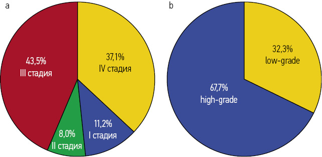 Распределение пациентов соответственно стадии опухолевого процесса, верифицированной лабораторно- инструментальным методом: с I – 11,2%, II – 8,0%, III – 43,5% и IV – 37,1% – стадиями заболевания, приведено на рис. 1, а. Также пациенты были разделены по степеням дифференцировки опухолевого процесса: low-grade серозный рак составил 32,3%, high-grade серозный рак составил 67,7% (рис. 1, b). Средний возраст пациенток – 57±12 лет.