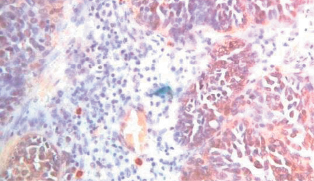 Рис. 7. Экспрессия антигенов СD8+ клеточной поверхности Т-лимфоцитов в микроокружении ЭРЯ, ×200.